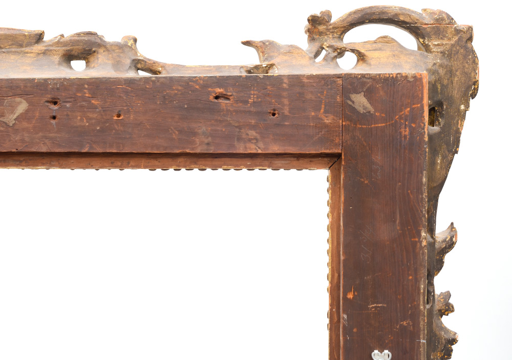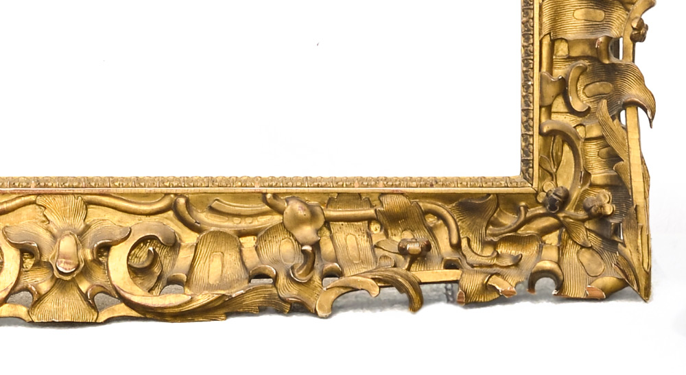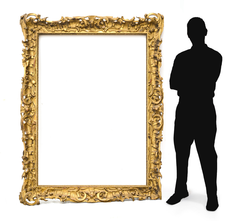 MUSEUM SIZE SHOW STOPPING PIERCE CARVED 19TH CENTURY GILDED FRAME: Overall measures 57'' x 72'' x 4.5''., inset size 43.5'' x 60''.