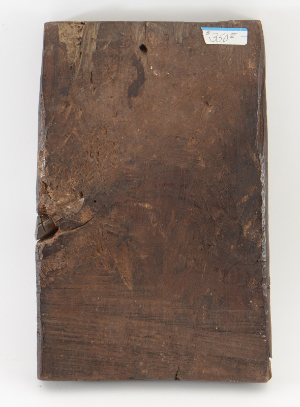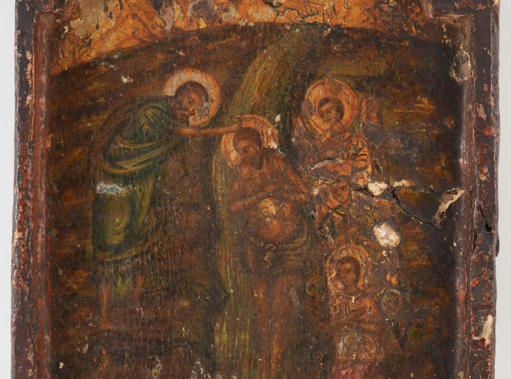 EARLY RELIGIOUS ICON PAINTING: Unusual Scene with Saints and Christ in a River, painted on recessed thick wooden planks, overall 13'' x 8'', painted images 10.5'' x 7.5''.