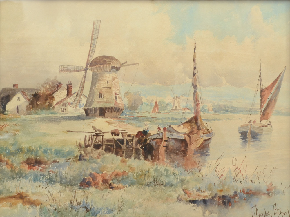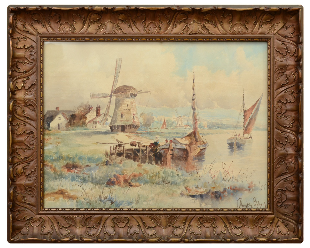 PRITCHARD, G. Thompson, (New Zealand, 1878-1972): Dutch Summer Scene on the River with Windmills, Watercolor, sight size 14.5'' x 19.5'', period gilded gesso frame, 20.5'' x 25.5''.