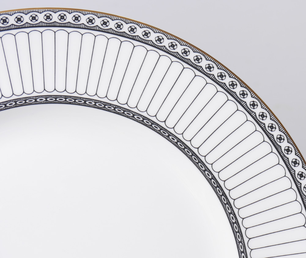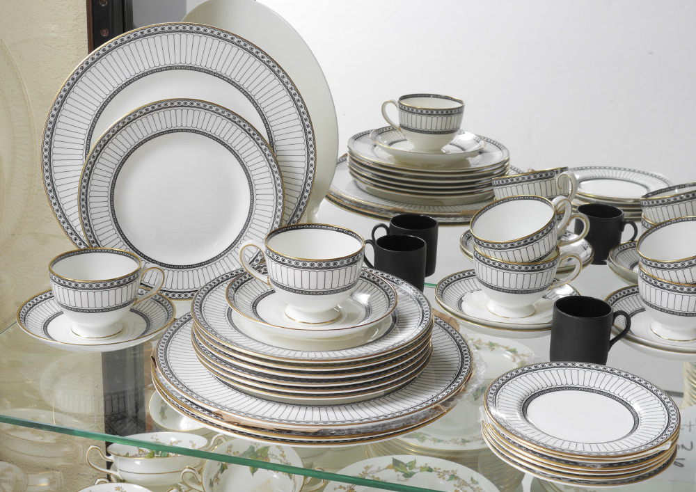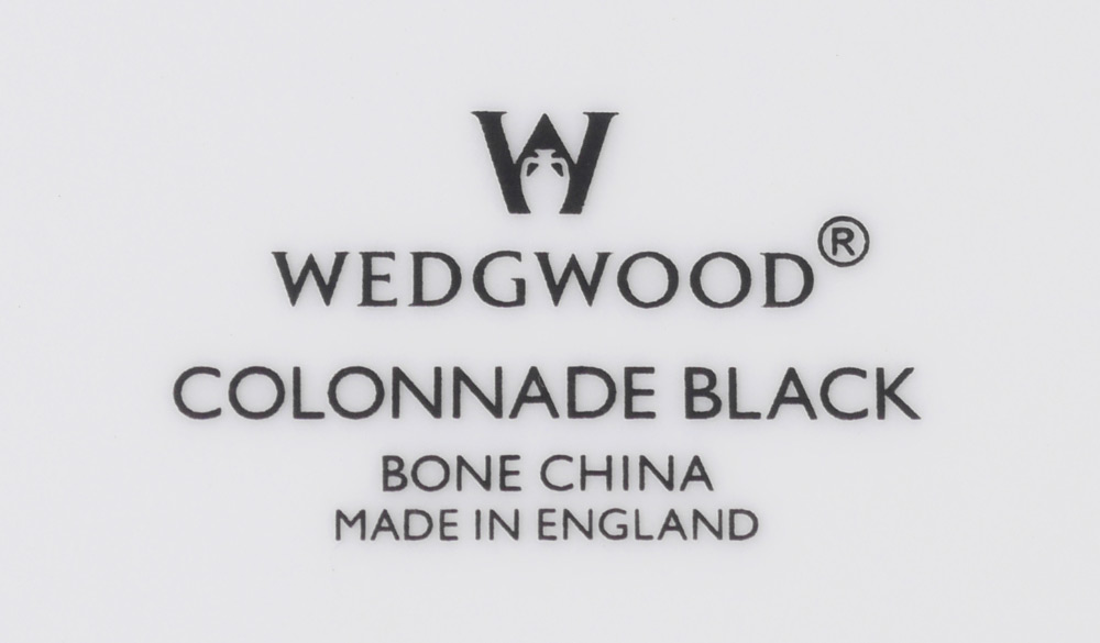 WEDGWOOD COLONNADE BLACK FINE CHINA: Black geometric rim. 40 pieces to include 8 dinner plates (10 5/8''), 8 salad plates (8''), 8 soup bowls, 6 bread plates, 8 cups and 8 saucers.