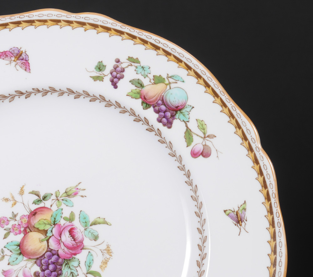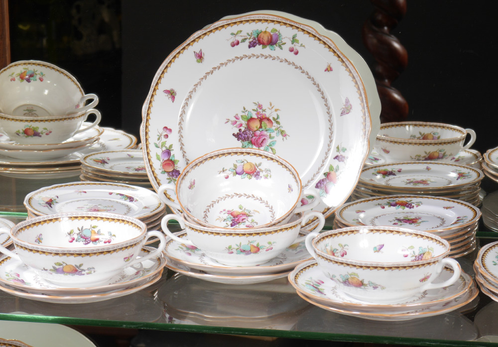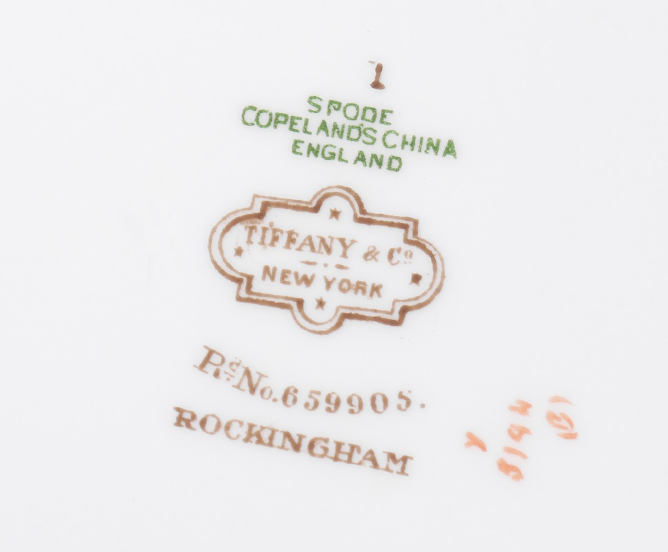 SPODE CHINA FOR TIFFANY IN THE ROCKINGHAM PATTERN: Approx. 63 pieces to include 15 dinner plates (10 1/4''), 15 cream soup bowls with 12 saucers, and 12 bread plates.