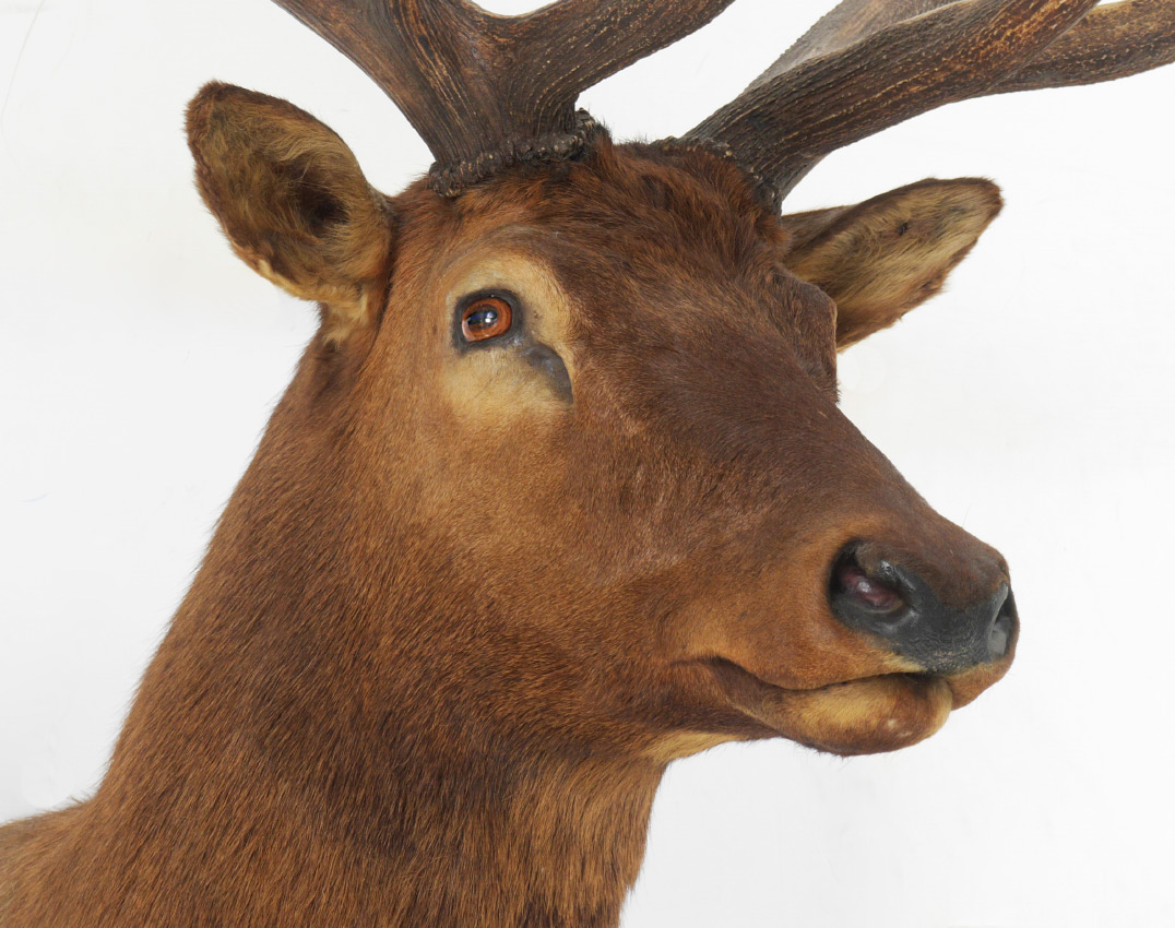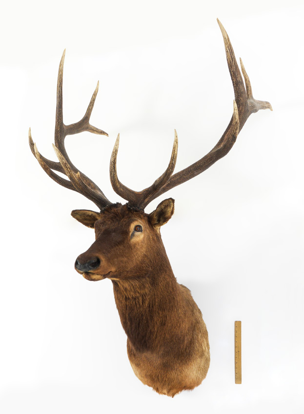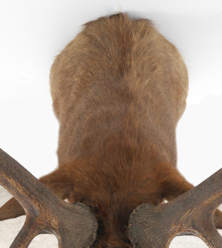 LARGE ELK TAXIDERMY MOUNT: Nearly a record trophy on the Boone & Crockett scoring system, taken on the Garrett Ranch in Wyoming. Overall measures approx. 70'' h. x 45'' at widest spread, x 44'' from wall to tip.