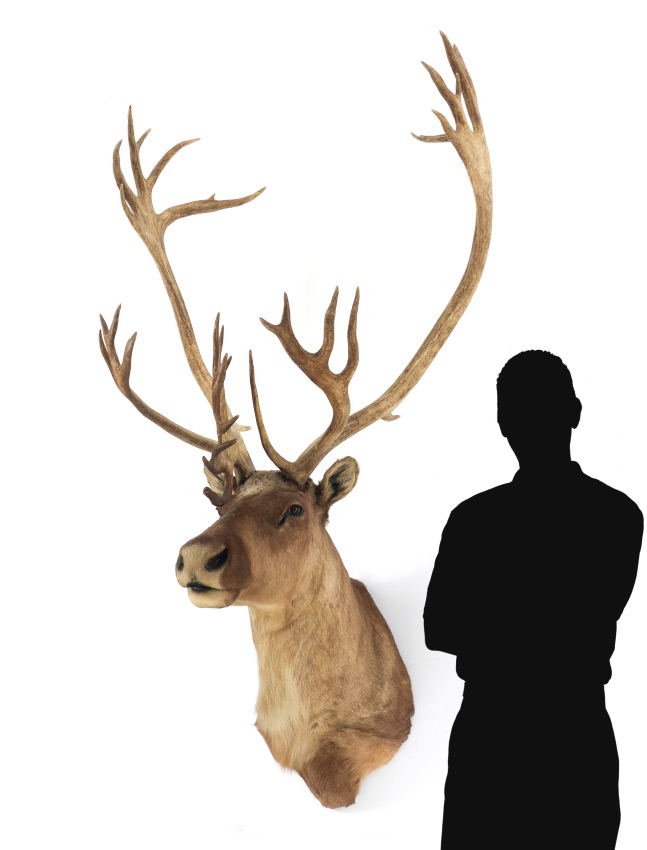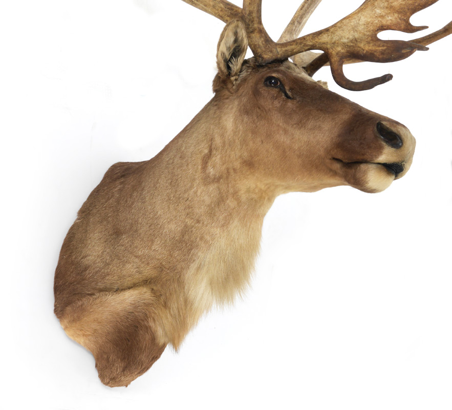 TAXIDERMY CARIBOU WALL MOUNT: Taken in Alaska in the 1970's, overall approx. 70'' h. x 37'' at widest spread x 31'' from wall to tip.