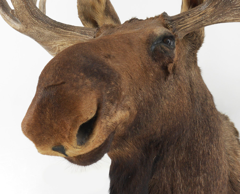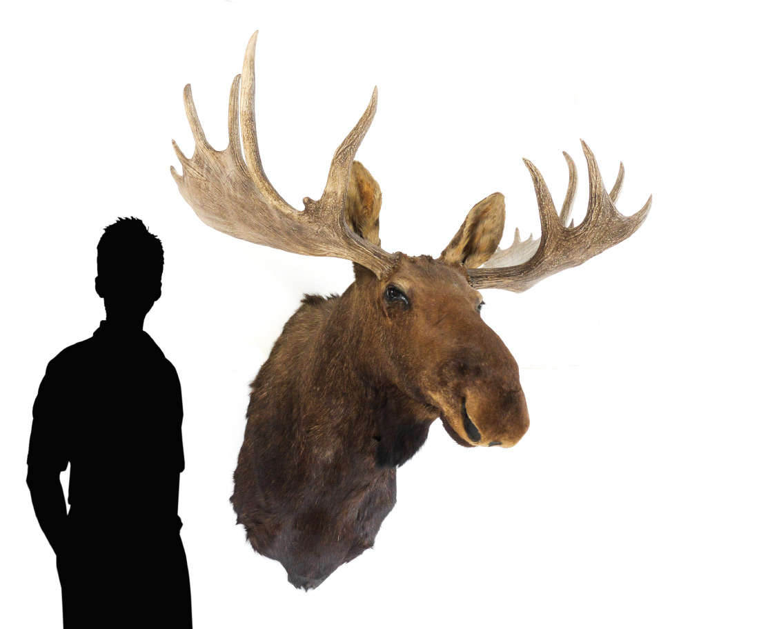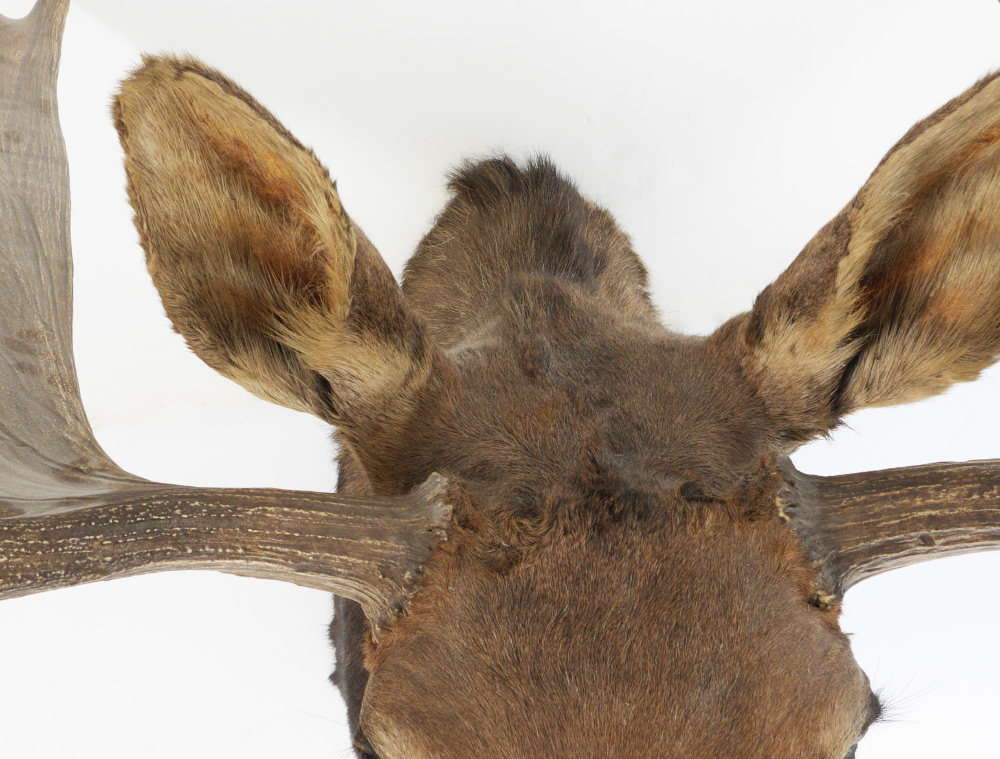 1700 LB LARGE TAXIDERMY BULL MOOSE MOUNT: Moose taken in Canada the 1970's, overall measures approx. 56'' high, 51'' across at widest spread, 42'' wall to tip of nose.