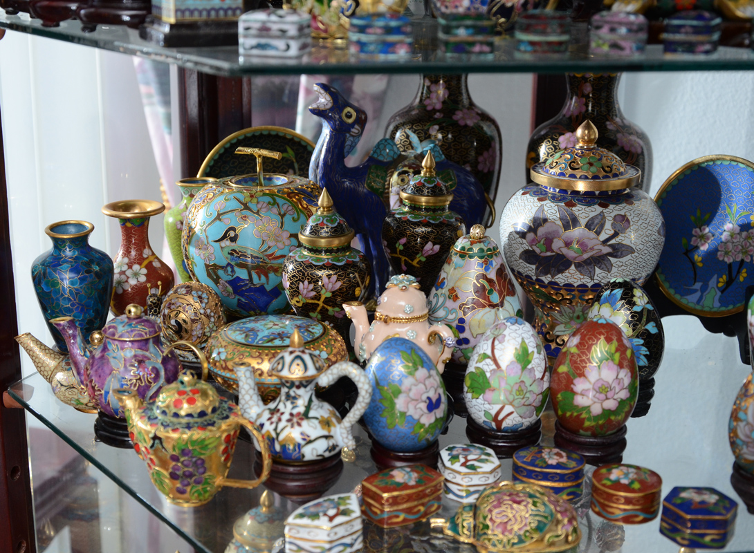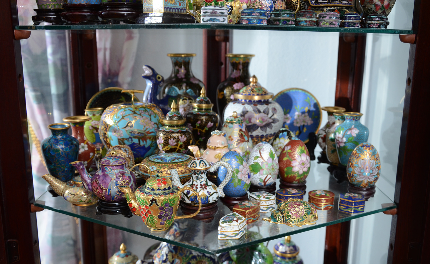 35 PIECE MINIATURE CLOISONNE COLLECTION: Contents of the second shelf of the display cabinet, lot 1144, approx. 35 pieces to include vases, covered jars, chargers, teapots, eggs, snail and beetle. Largest vase measures 6 1/2'' h.