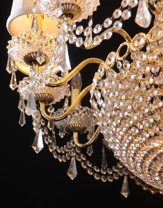 14 LIGHT BRASS AND CRYSTAL CHANDELIER: Reputedly from the Ritz in Sarasota, brass frame with crystal garland and prisms, approx. 32'' h. x 28''.