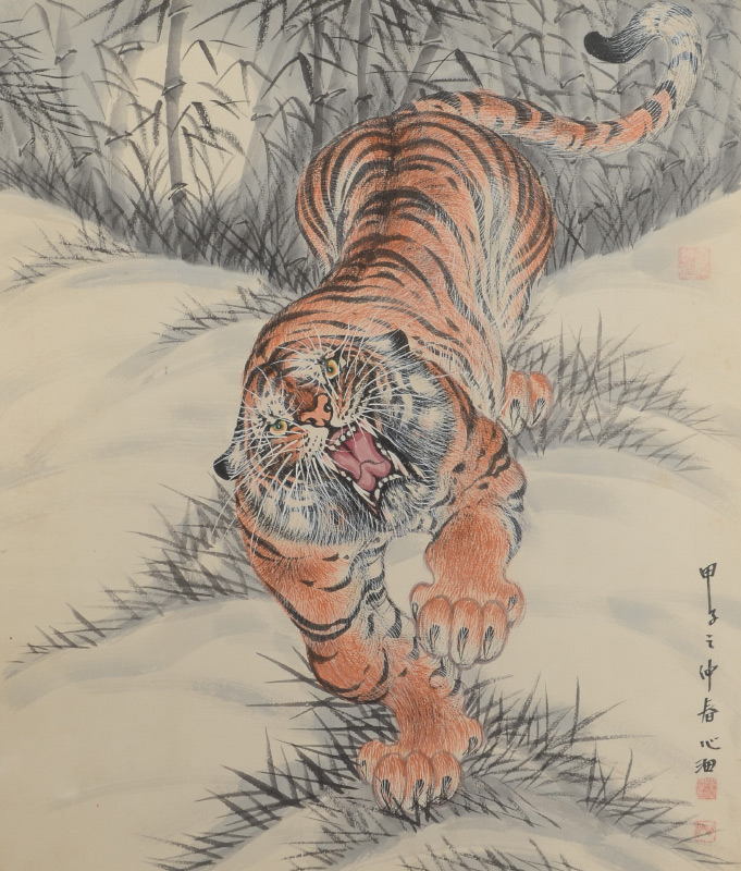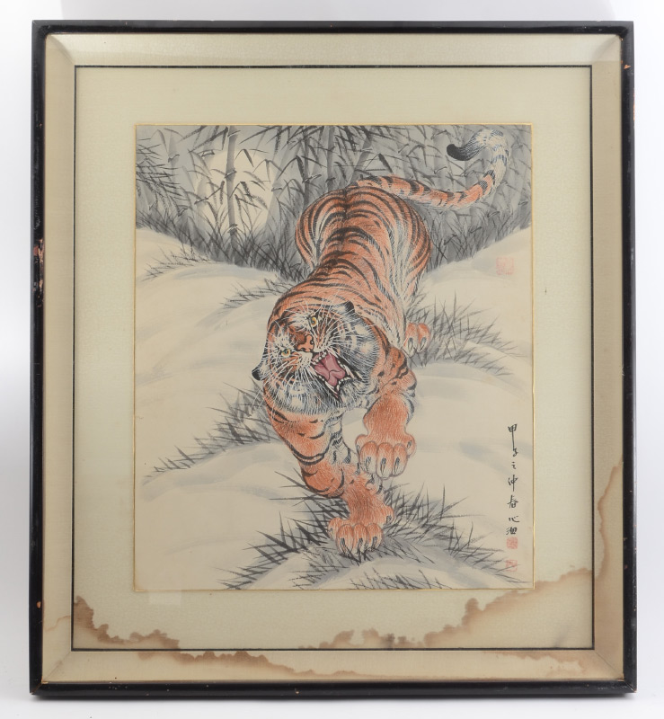 ORIENTAL WATERCOLOR OF A ROARING TIGER: 21'' x 17.5'', signed lower right, framed, 29.5'' x 26.5''.