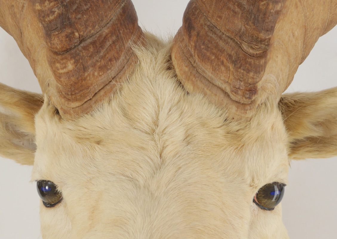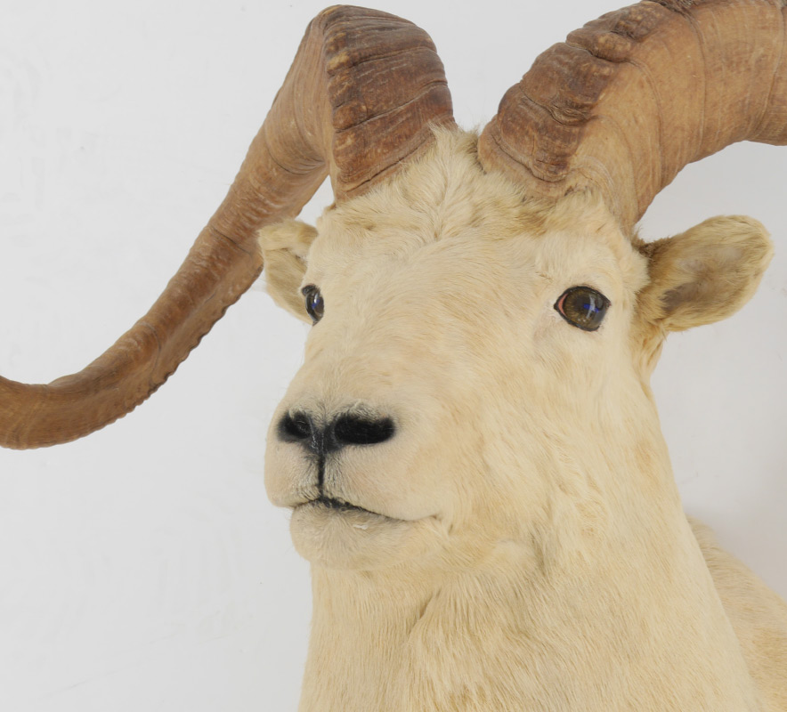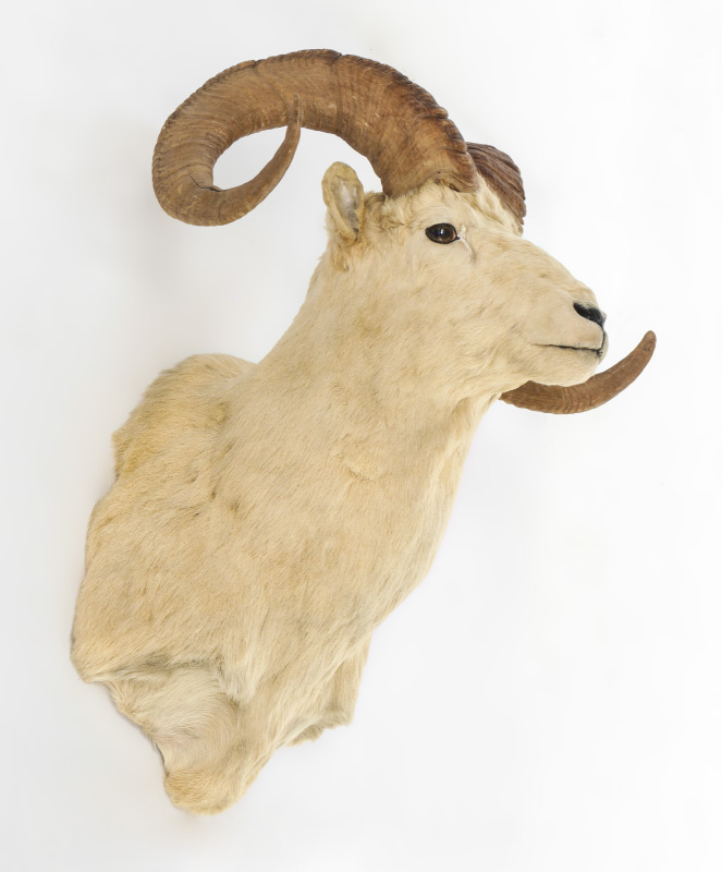 TAXIDERMY DALL SHEEP WALL MOUNT: Taken in Alaska in the 1970's, measures approx. 30'' h. x 29 1/2'' at widest spread x 20'' from wall to tip.
