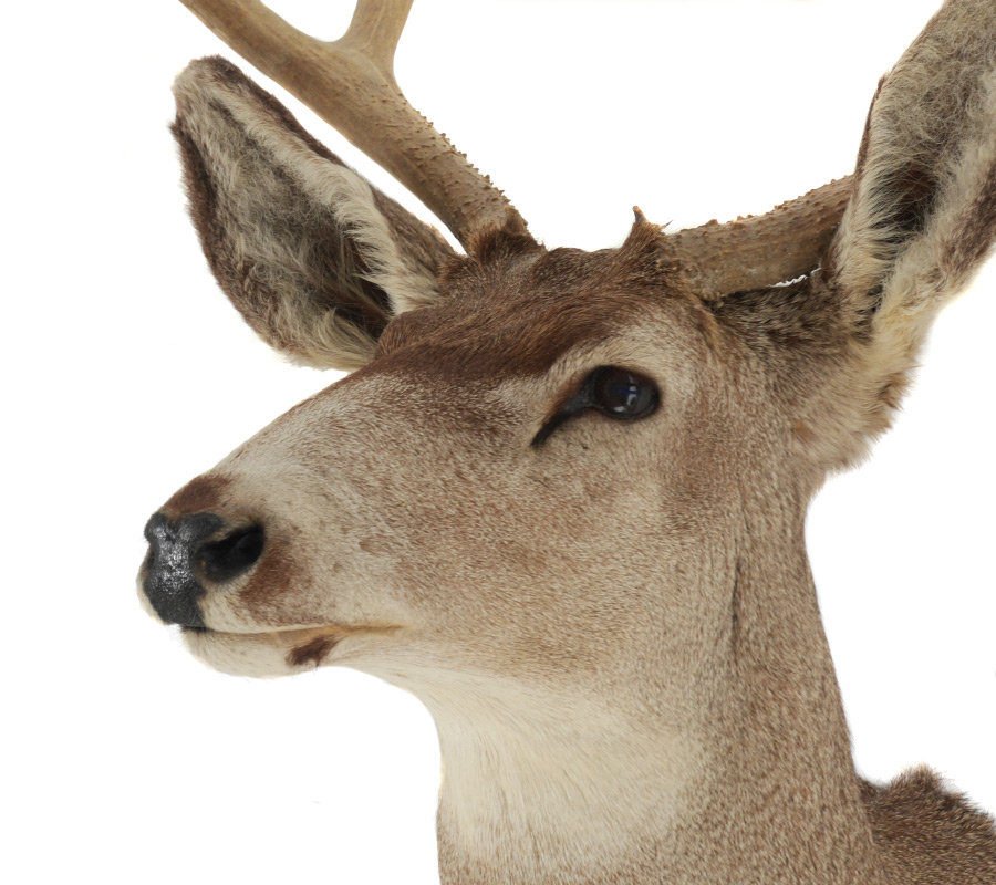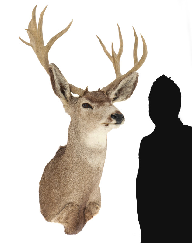 TAXIDERMY MULE DEER WALL MOUNT: Taken on the Garrett Ranch in Wyoming. Overall measures approx. 48'' h. x 23'' at widest spread x 21'' from wall to tip.