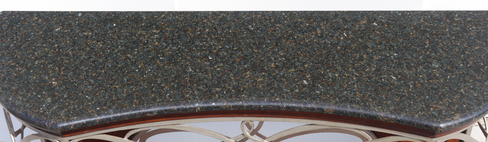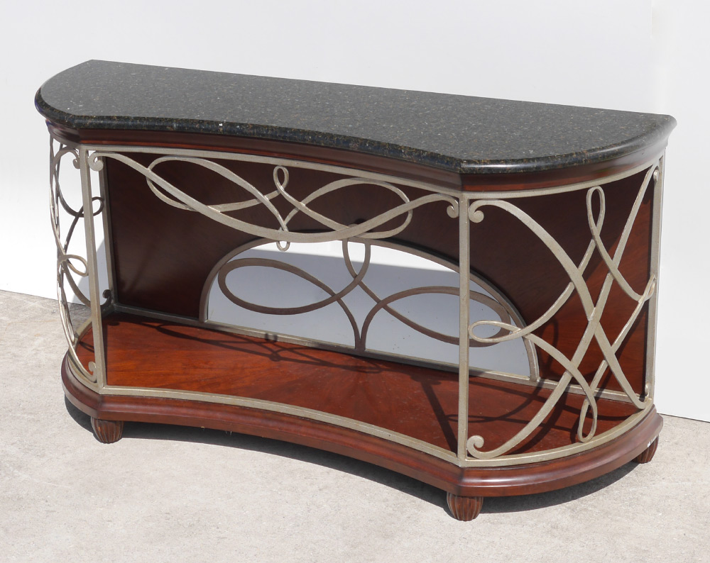 GRANITE TOP WROUGHT IRON FOYER TABLE: Shaped granite top supported by silver paint decorated wrought iron supports, mahogany back and open lower shelf. Overall measures 35 1/2'' h. x 66 1/2'' x 21 1/2''.