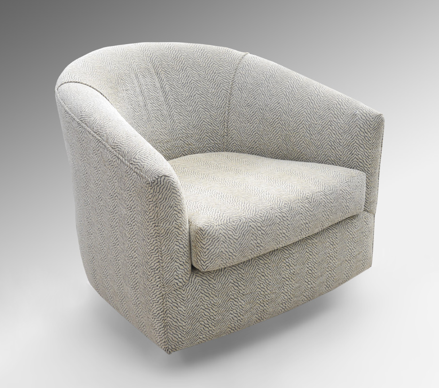 MILO BAUGHMAN BRASS SWIVEL LOUNGE CHAIR FOR D.I.A.: Thin zebra striped upholstered barrel back swivel chair, 27'' h. x 31'' x 32''.