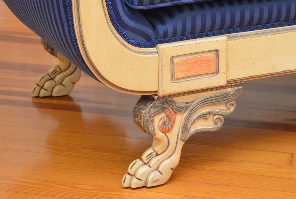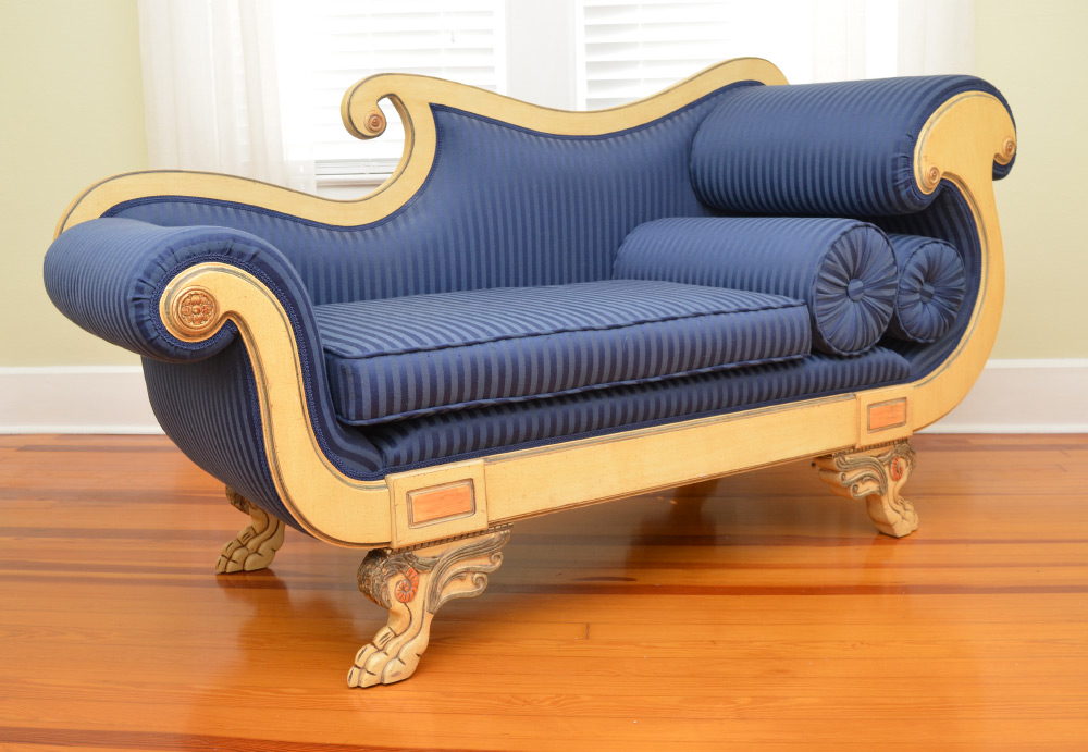 RUSS SINES & SONS CUSTOM CHAISE LOUNGE: Hand crafted by Russ Sines & Sons, sweeping back and scroll arms, blue striped upholstery, carved paw feet. Measures 37 1/2'' h. x 70'' x 25''.