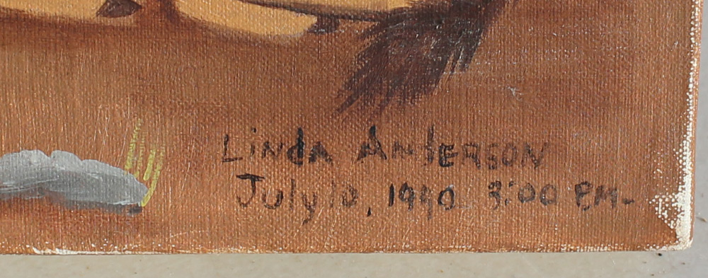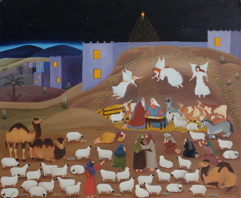 ANDERSON, Linda, (American, 20th century): Religious Themed painting with Manger, Oil/Canvas, 25'' x 30'', signed lower right, dated July 10, 1990, unframed.