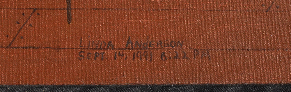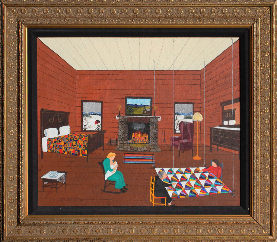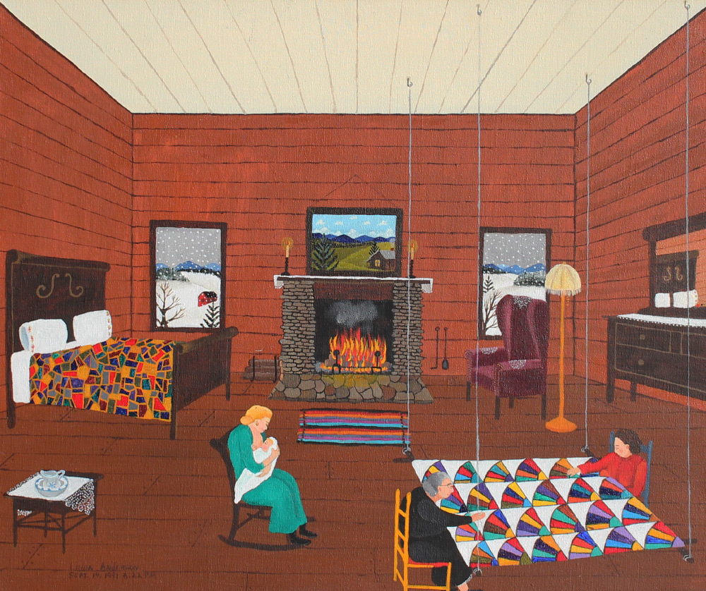 ANDERSON, Linda, (American, 20th century): Interior Winter Scene with Mother Breast Feeding and 2 Quilters by Fire Place, Oil/Canvas, 20'' x 24'', signed lower left, dated September 14, 1991, framed, 28'' x 32''.