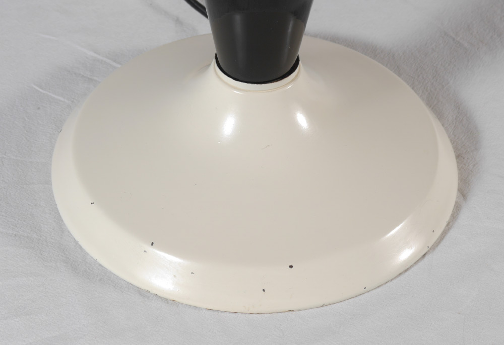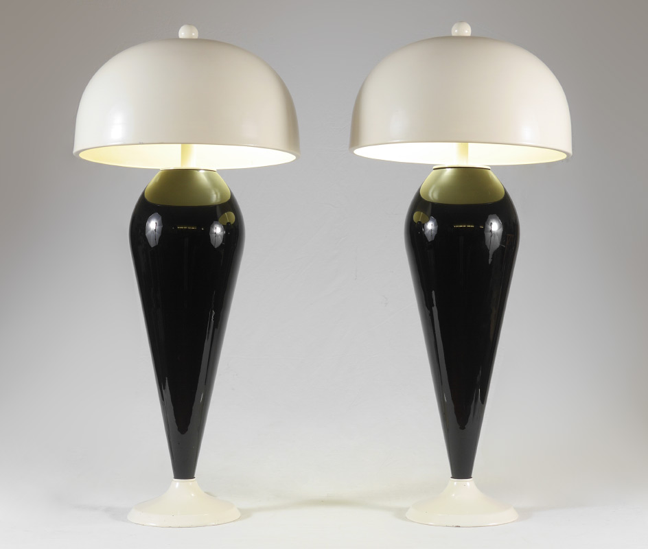 PAIR MID CENTURY GLASS BASE LAMPS: Deep blue glass teardrop form bodies on white spun aluminum base, double socket fixture, white spun aluminum dome shades. Overall measure 37'' h. x 17'' shade dia.