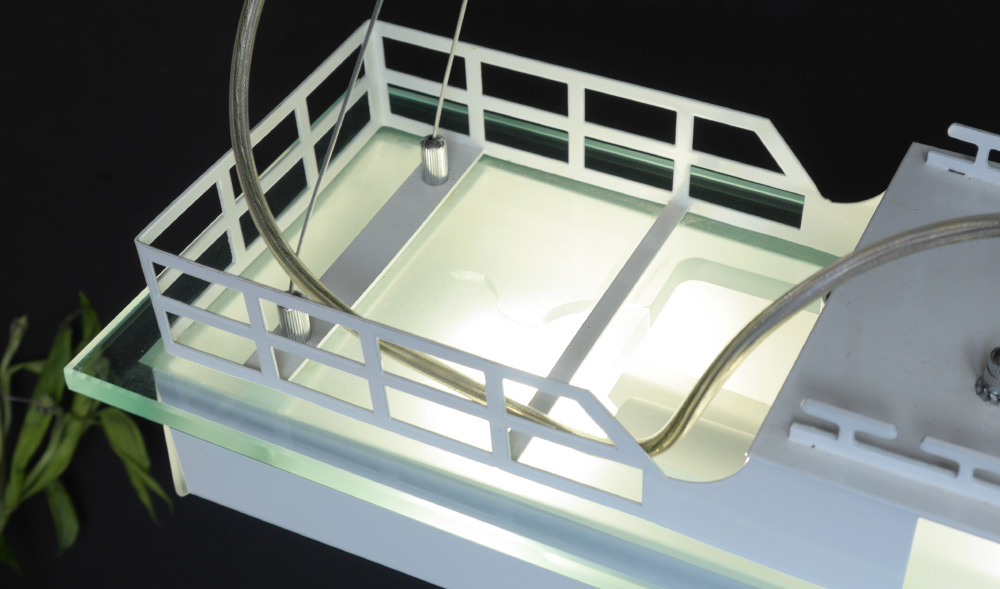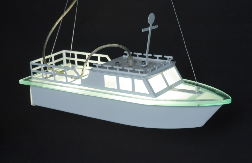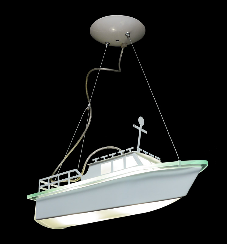 MODERN YACHT FORM HANGING LIGHT: Unique ceiling light fixture in the shape of a yacht, frosted glass and metal construction, hangs from wires from ceiling cap. Measures 9 1/2'' h. x 19'' x 6 1/4''.