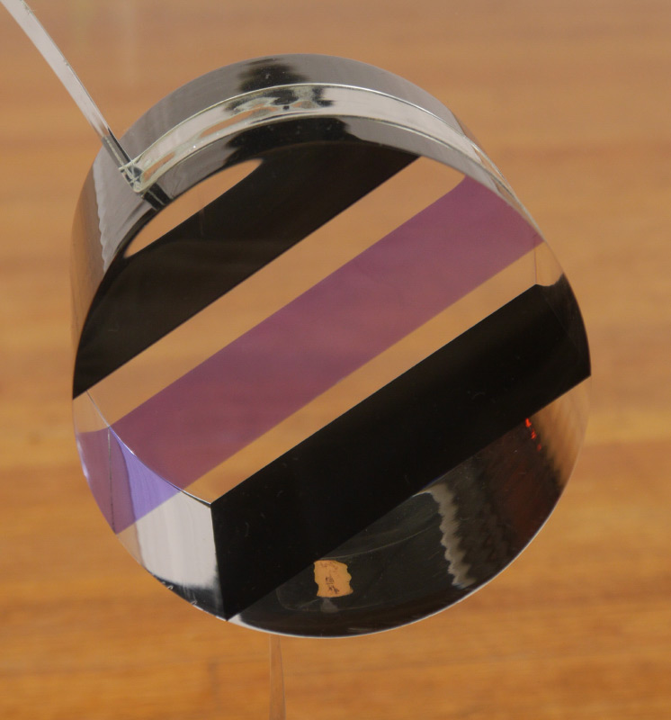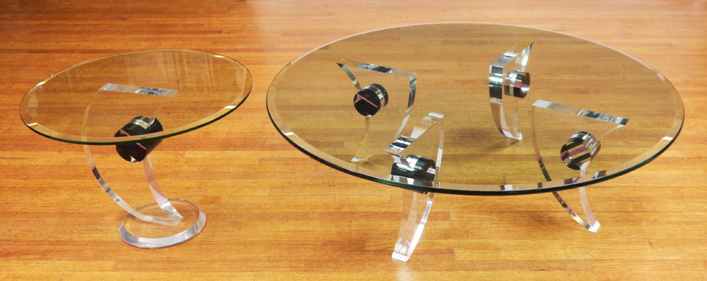 MODERNE GLASS TOP AND LUCITE COFFEE AND SIDE TABLE: Matching set each with Lucite legs or base with striped amber and clear inserts, beveled glass tops. Coffee table measures 16'' h. x 55'' dia., 20'' h. x 28''.