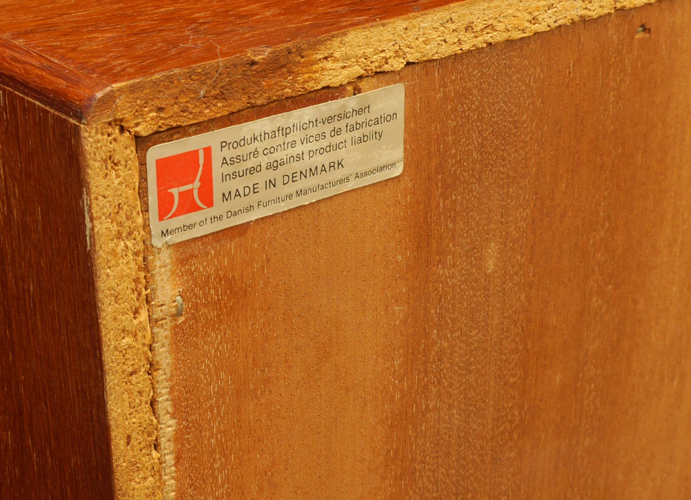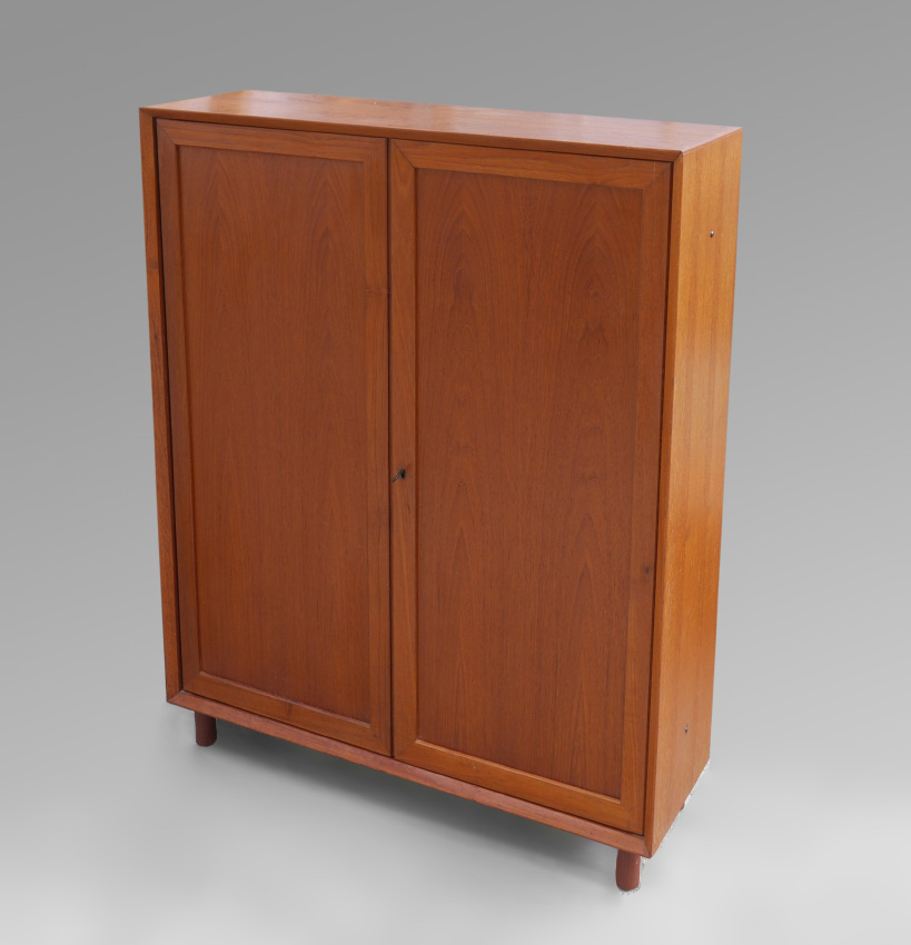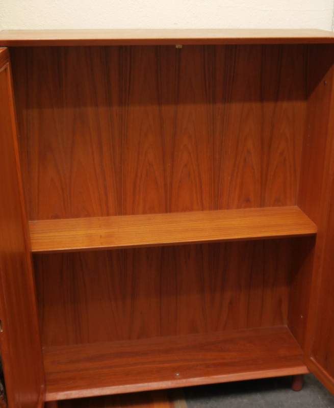 DANISH TEAK TWO DOOR MID CENTURY CABINET: Danish control foil label on back, appears to have been the top section of a sideboard with legs added. Overall measures 49'' h. x 39 1/4'' x 12''.