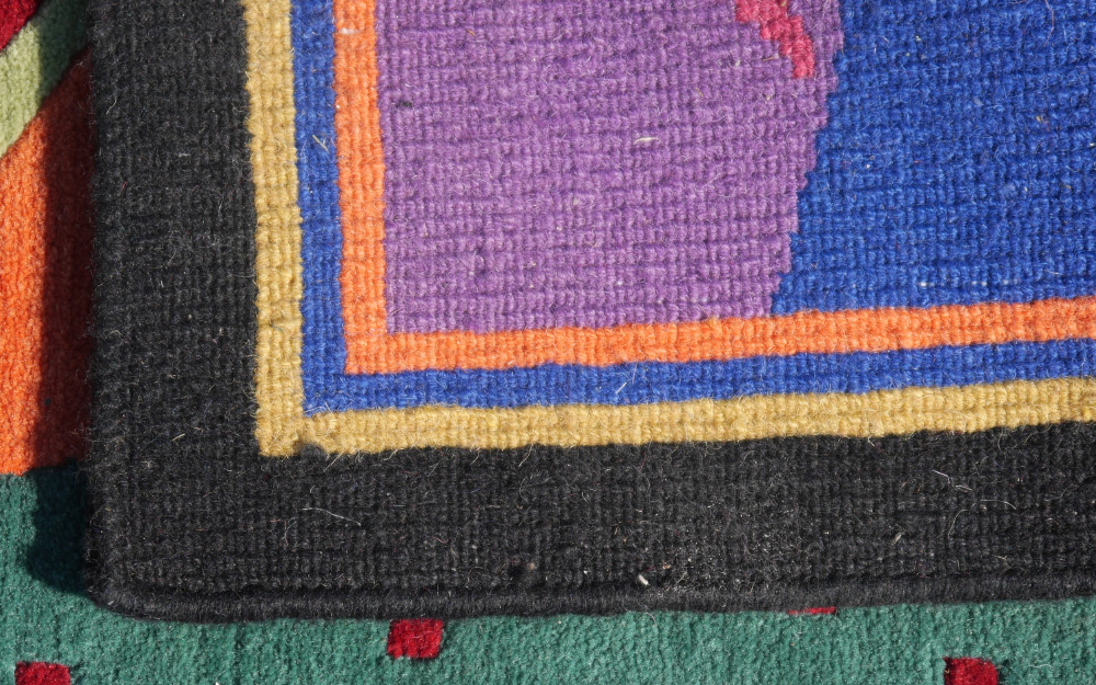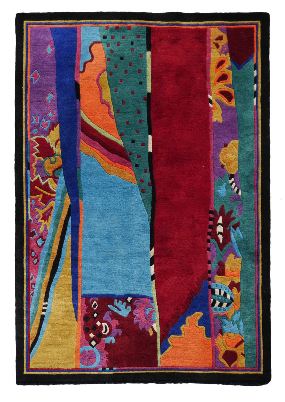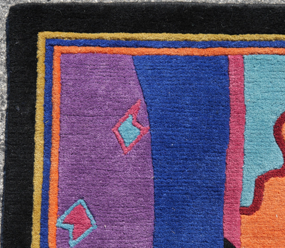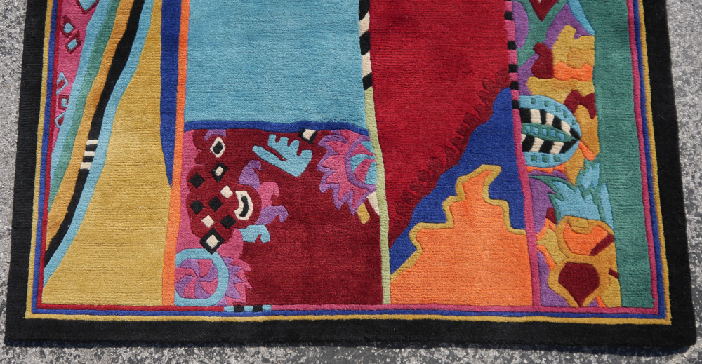 APPROX. 20-30 YR OLD HAND HELD MACHINE TUFTED WOOL RUG, 4'6'' x 6'4'': This interesting rug has the look of a Modernist painting. Its unique design and good colors will make it a conversation piece wherever it is placed. Condition is good.