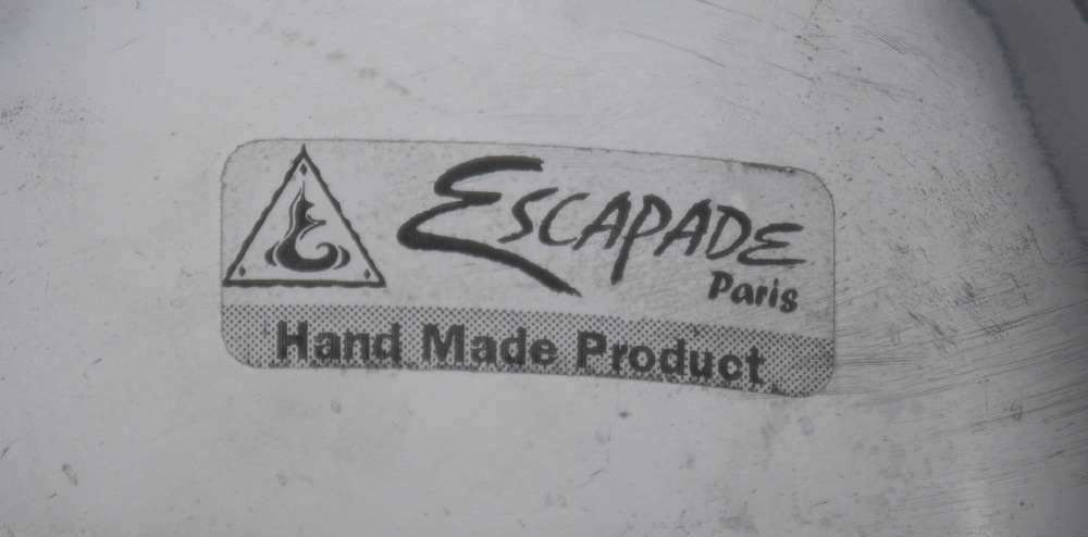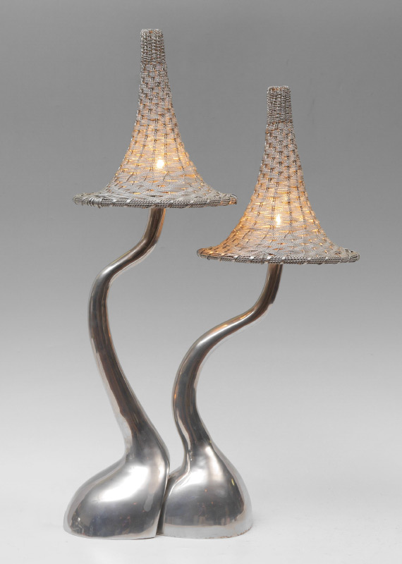 PAIR ESCAPADE PARIS NESTING ALUMINUM LAMPS: 2 nesting table lamps by Escapade Paris, aluminum biomorphic bases, woven aluminum shades, requires halogen lights. Taller of the 2 measures 3'' h. x 10 1/2''.