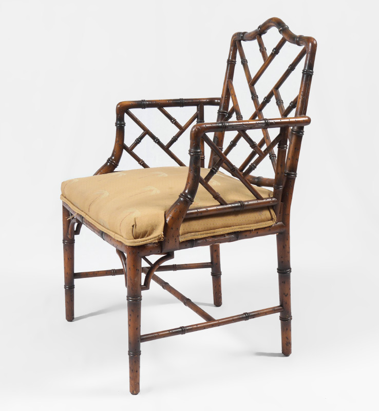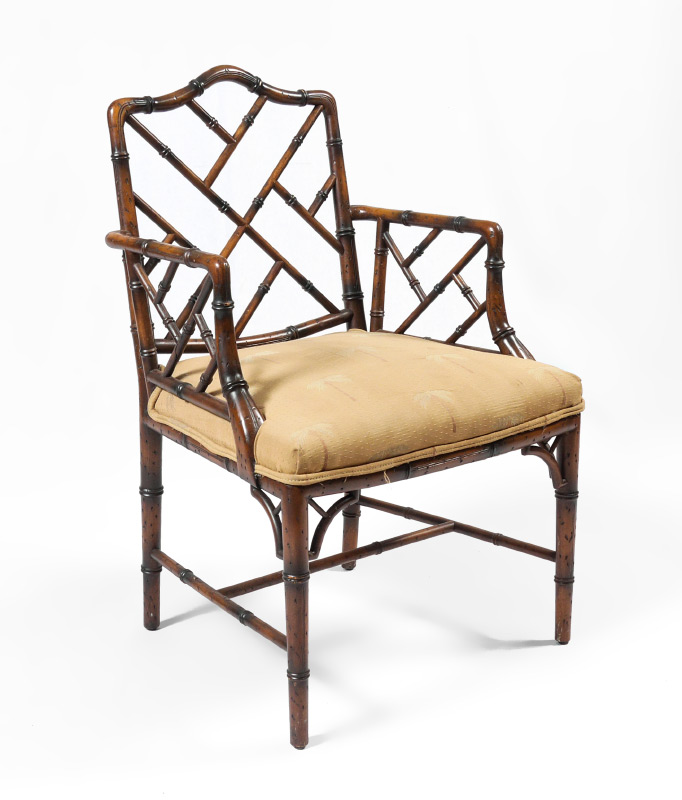 CARVED FAUX BAMBOO ARM CHAIR: Carved faux bamboo frame, palm tree motif upholstered cushion. Measures 37'' h. x 23'' x 23 1/4''.