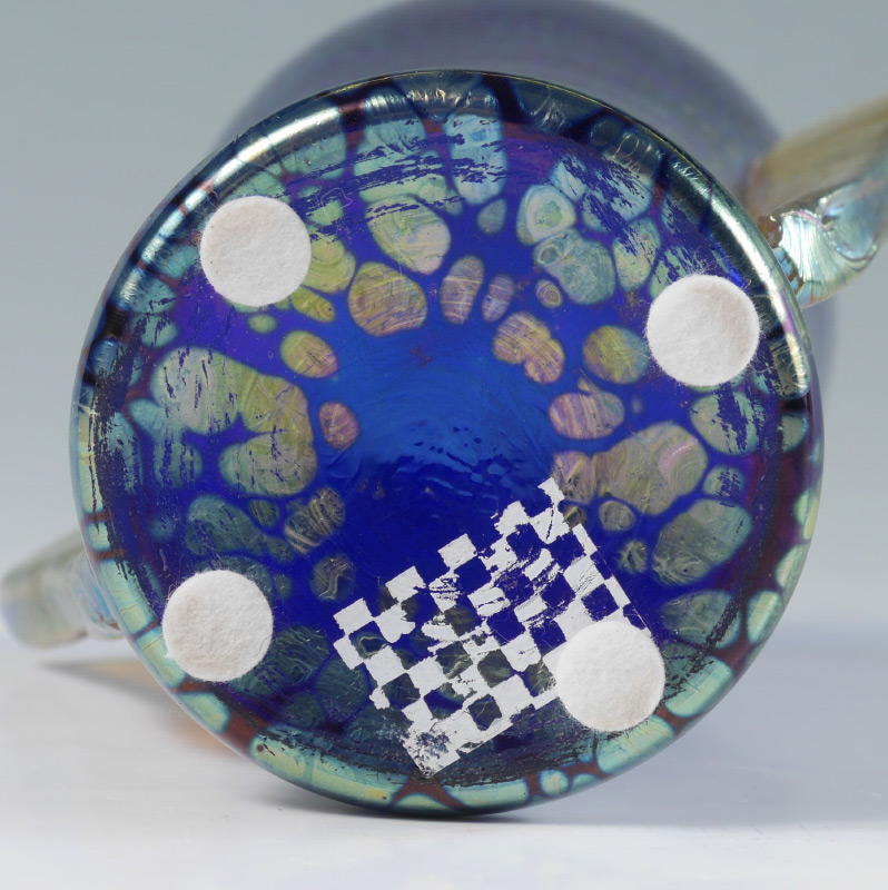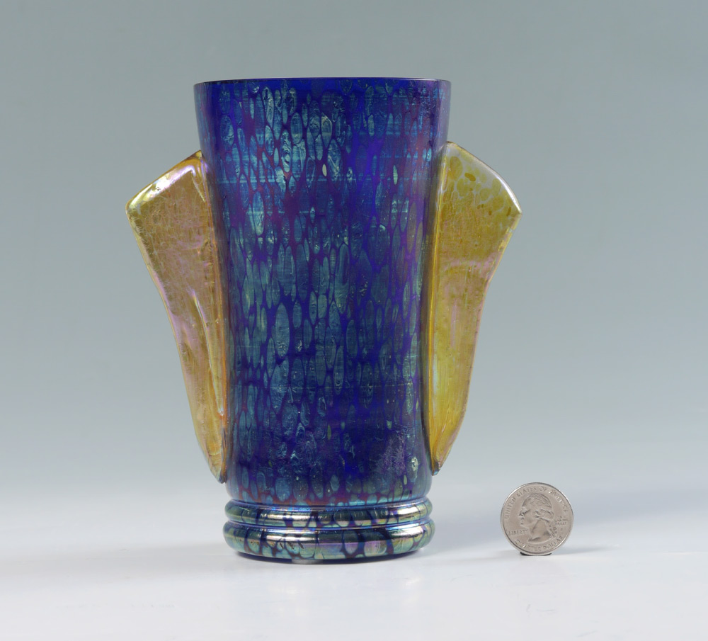 LOETZ COBALT PAPILLON ART DECO VASE: Unsigned attribution to Loetz in the Papillon pattern, cobalt body with gold flared handles, 6 1/4'' x 5 1/4''.