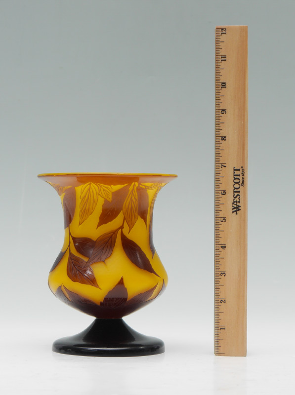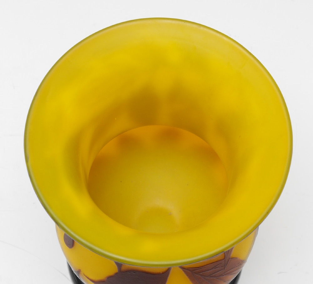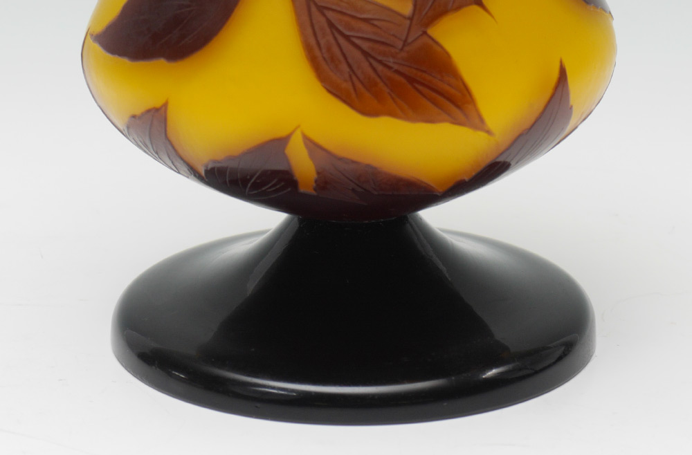 LOETZ YELLOW CAMEO GLASS VASE: Unsigned attribution to Loetz, foliate and berry design on yellow ground, black glass foot. 6 3/4'' h. x 5 1/4''.