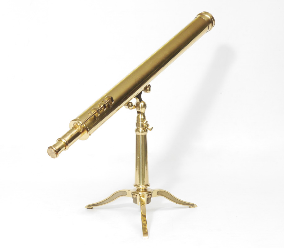 TASCO BRASS TELESCOPE ON TRIPOD: 60 x 60 Tasco 4B telescope on table tripod with folding legs. Overall on stand 21 3/4'' h. x 35'' x 16 1/4''.