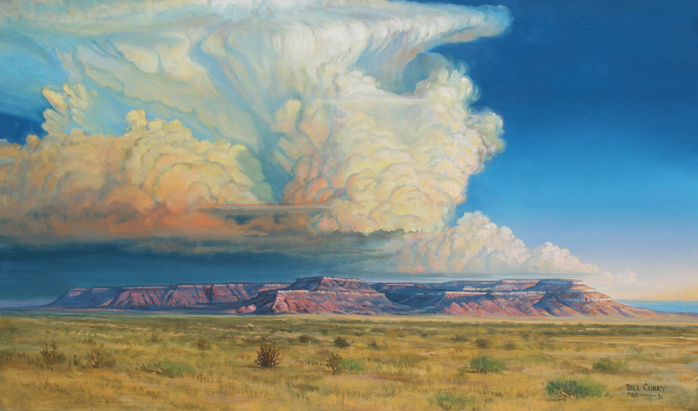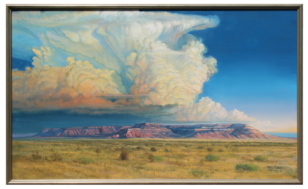 CURRY, Bill, (American, 20th century): Panoramic Scene with Fantastic Clouds and Sunset on the Mesa, Oil/Canvas, 36'' x 60'', signed lower right and dated 1988, framed 37.5'' x 61.5''.