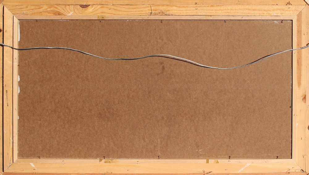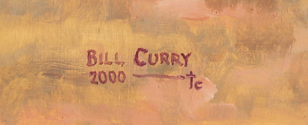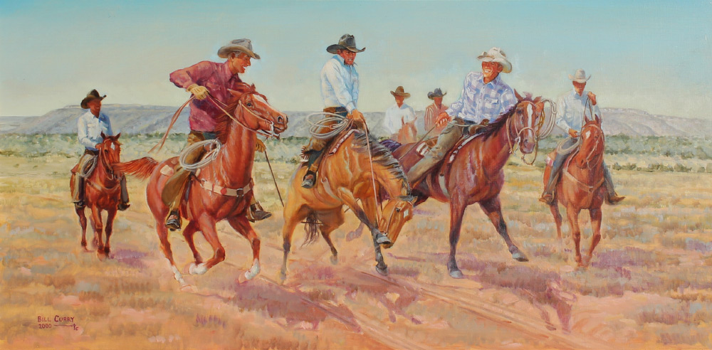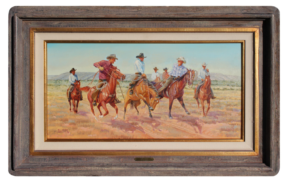 CURRY, Bill, (American, 20th century): ''Rimshot'', Cowboys Playing Around, Oil/Masonite, 16'' x 30'', signed lower left and dated 2000, titled verso, custom painted western frame, 25.5'' x 41''.