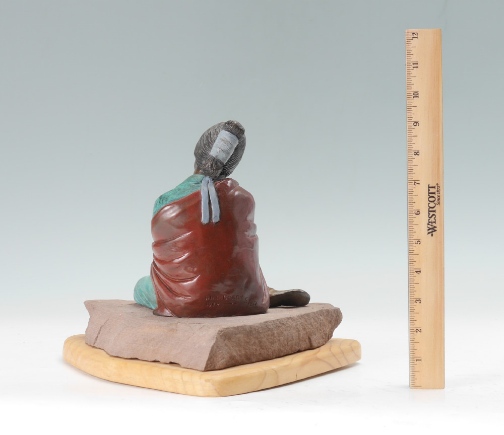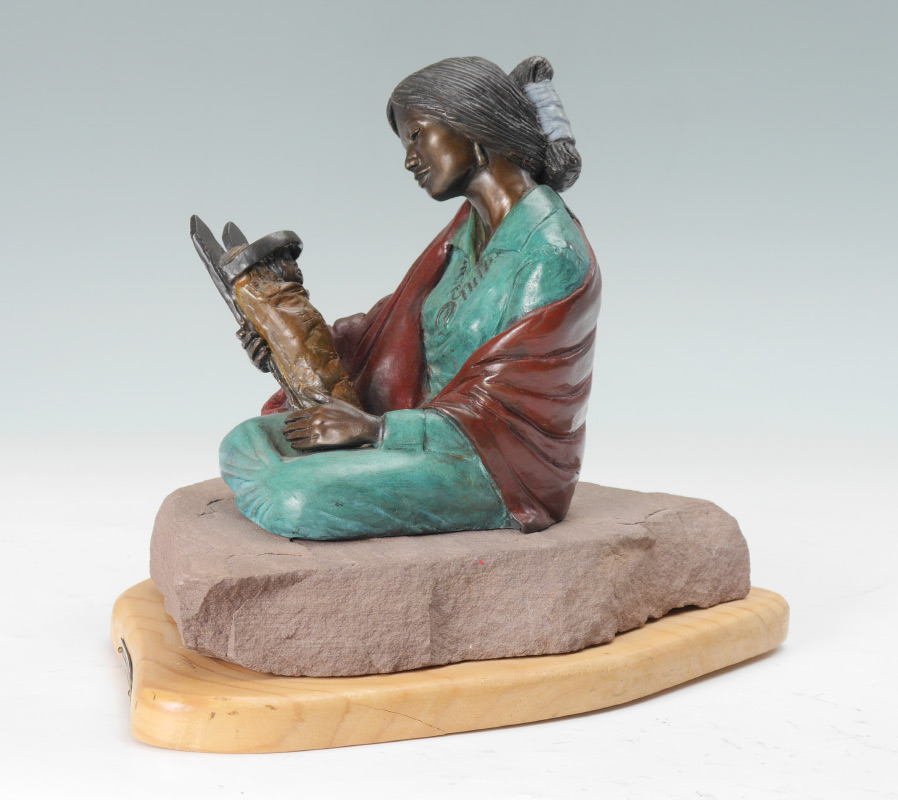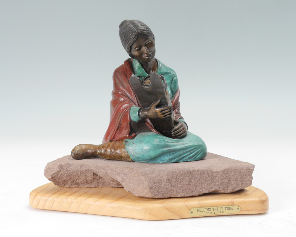 CURRY, Bill, (American, 20th century): American Indian Mother with Papoose, Cold Painted Bronze, 7.5'' h. affixed to stone plinth and custom revolving wood base. Signed and dated 1999, numbered 5/20.