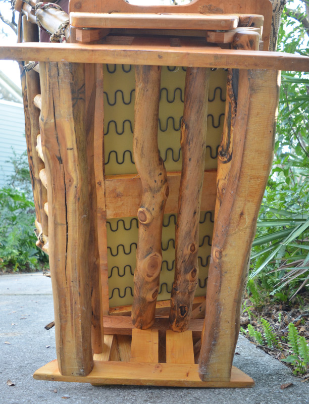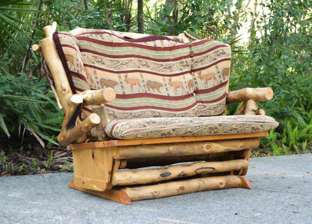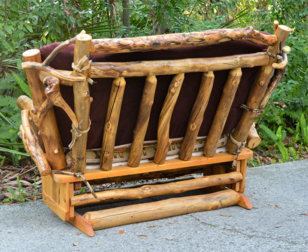 ASPEN LOG RUSTIC GLIDER SETTEE: Perfect for the cabin chic motif, rustic polished aspen log construction glider, upholstered seat, measures 42 1/2'' h. x 64'' x 38''.