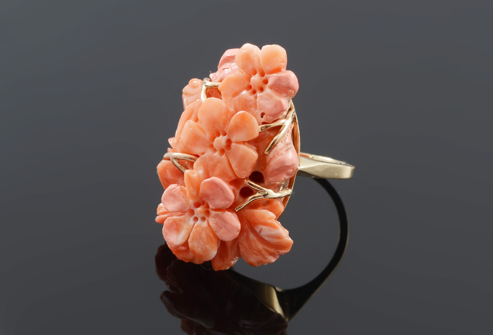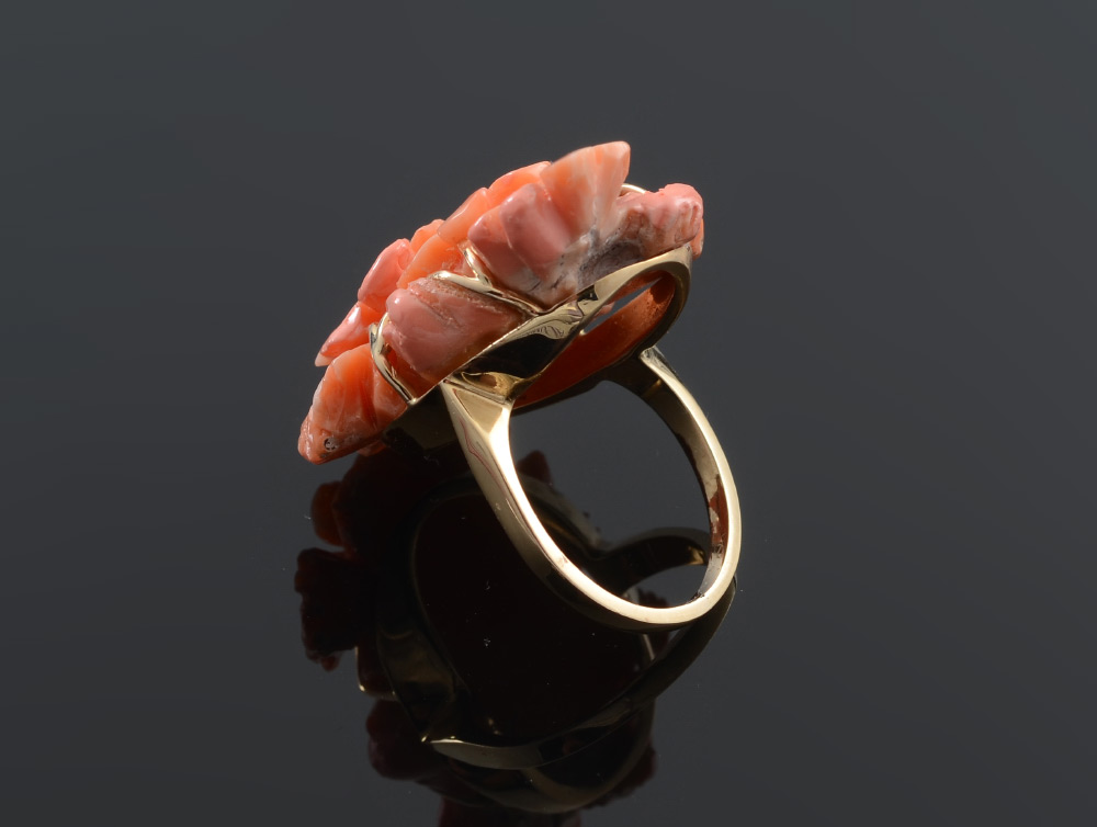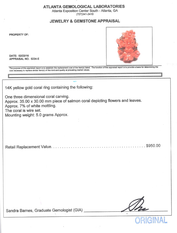 14K YELLOW GOLD CARVED CORAL RING: This 3 dimensional carved Salmon Coral ring depicts flowers and leaves and is wire set. Total weight is approx. 5.0 grams. Sold with current Atlanta Gemological GIA graduate's appraisal for $950.