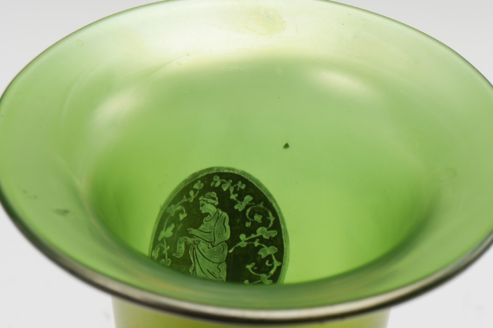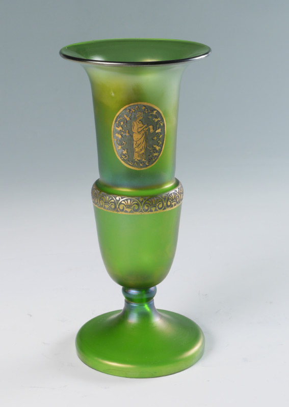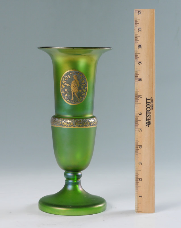 BOHEMIAN IRIDESCENT GREEN NEO-CLASSICAL VASE: Iridescent green body, flared rim, Greek or Etruscan figures on either side in medallions, foliate motif ring, flared foot, overall measures 10'' h. x 4 3/4''.