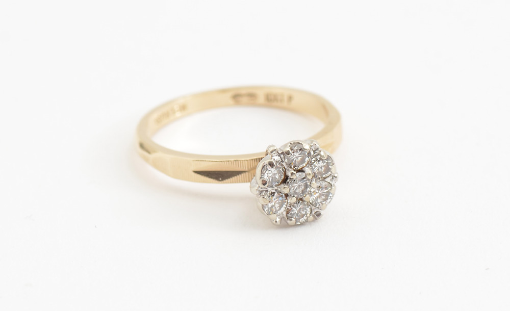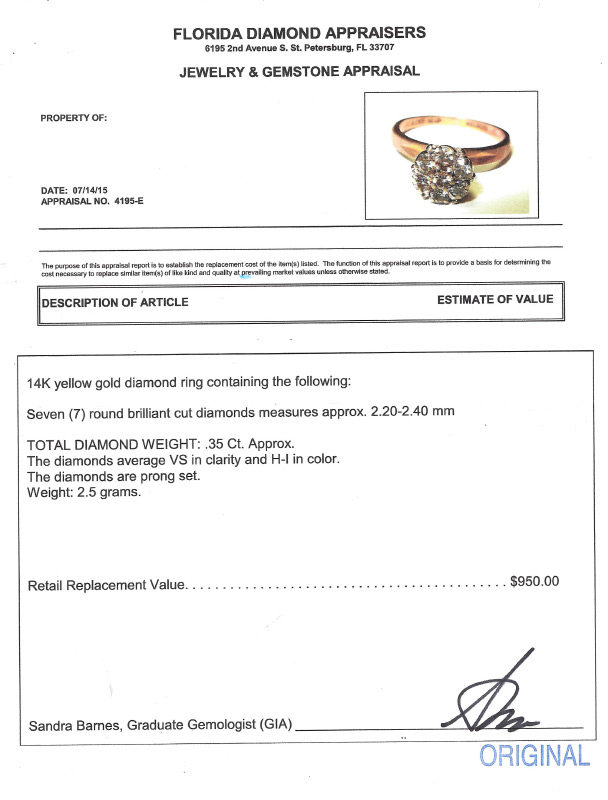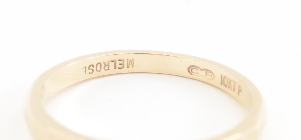 VINTAGE DIAMOND ENGAGEMENT RING: Brushed finish yellow gold ring with 7 round brilliant diamonds totaling approx. .35 Ct., averaging VS clarity and H-I color. Inscribed ''Melrose'', stamped 10K P. (plumb).