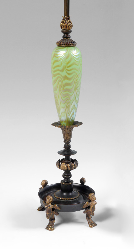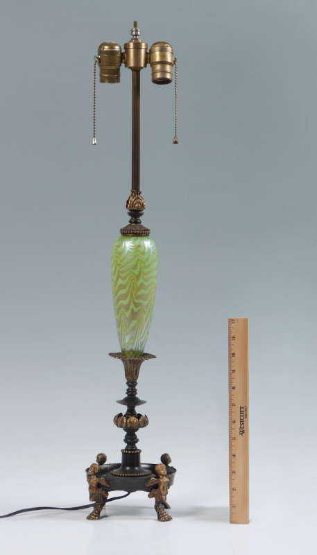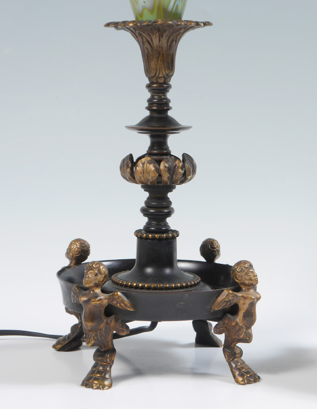 DURAND KING TUT IRIDESCENT ART GLASS LAMP: By the Crest Lamp Company, figural gilt metal winged angel feet, dish base, leaf motifs, double socket fixture. Green King Tut motif body, 30'' h. x 6 3/4'' dia.