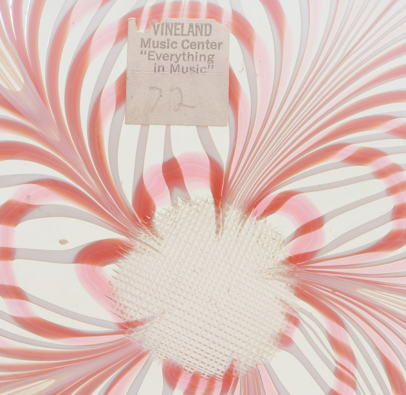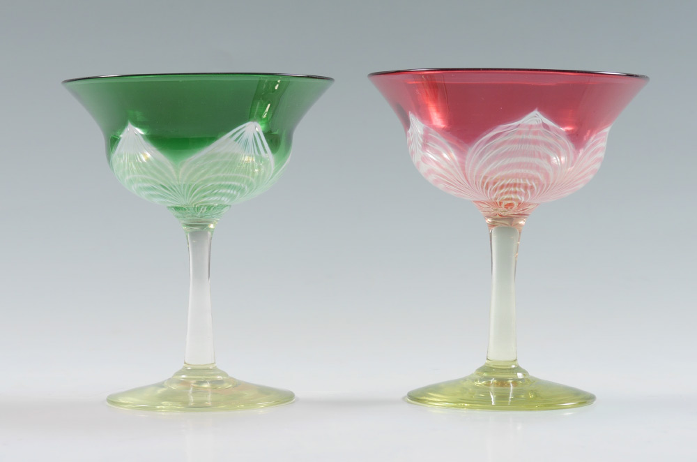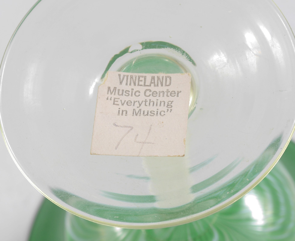 4 PIECE DURAND CRANBERRY & GREEN PULLED FEATHER GLASS: 4 piece total, none signed, to include 1) Cranberry charger, 14 1/4'' dia. 2) Bowl, 3 3/8'' h. x 8 1/4''. 3-4) Green and cranberry cordial stems, 4 1/4'' h. x 3 1/2''.