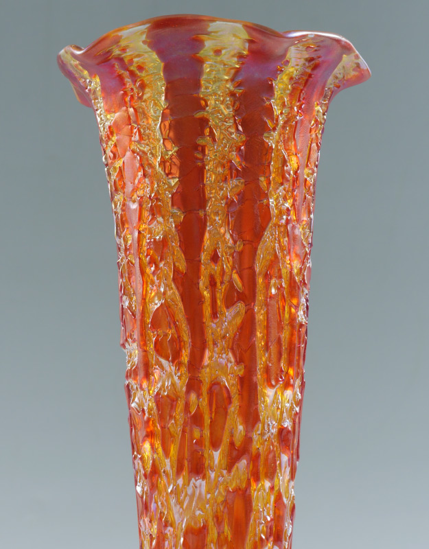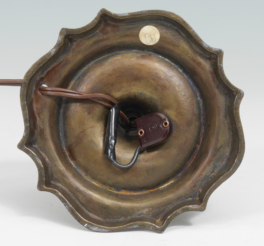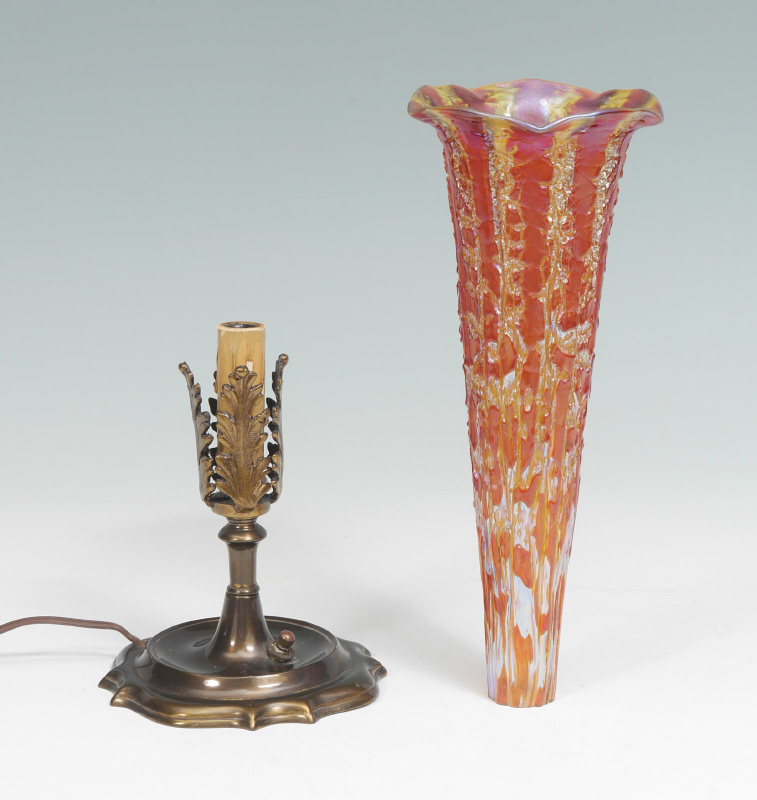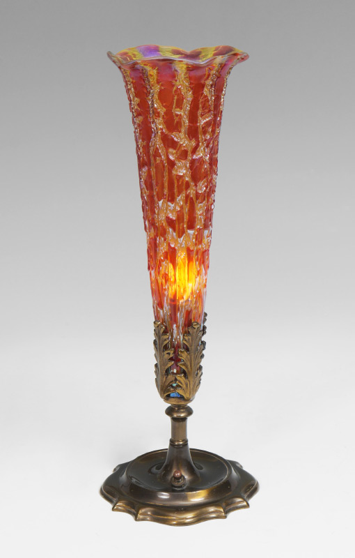 DURAND MOORISH CRACKLE LAMP: Amber ''Moorish Crackle'' trumpet shade with ruffled rim, unsigned. Patinated metal base with single socket fixture, overall 15'' h. x 5 1/2''. Shade 11 1/2'' h. x 4 1/2'', base 1 1/4''.