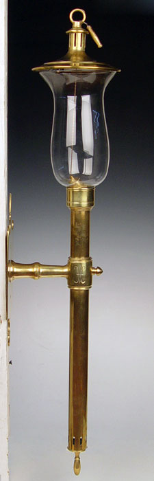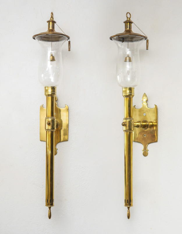 PAIR BRASS CANDLE SCONCE TORCHIERES: Pair of single candle lights with glass shades and original heat caps with chain attached candle snuffers. The brass portion is 19'' tall shades are 8''.