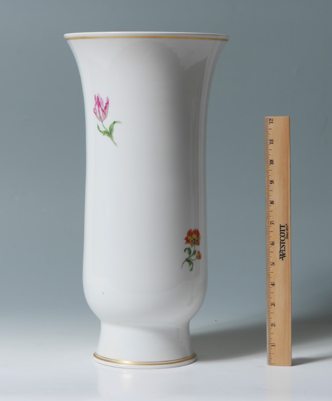 16'' TALL MEISSEN PORCELAIN VASE: Hand painted floral design on pure white. Blue cross sword mark under glaze.