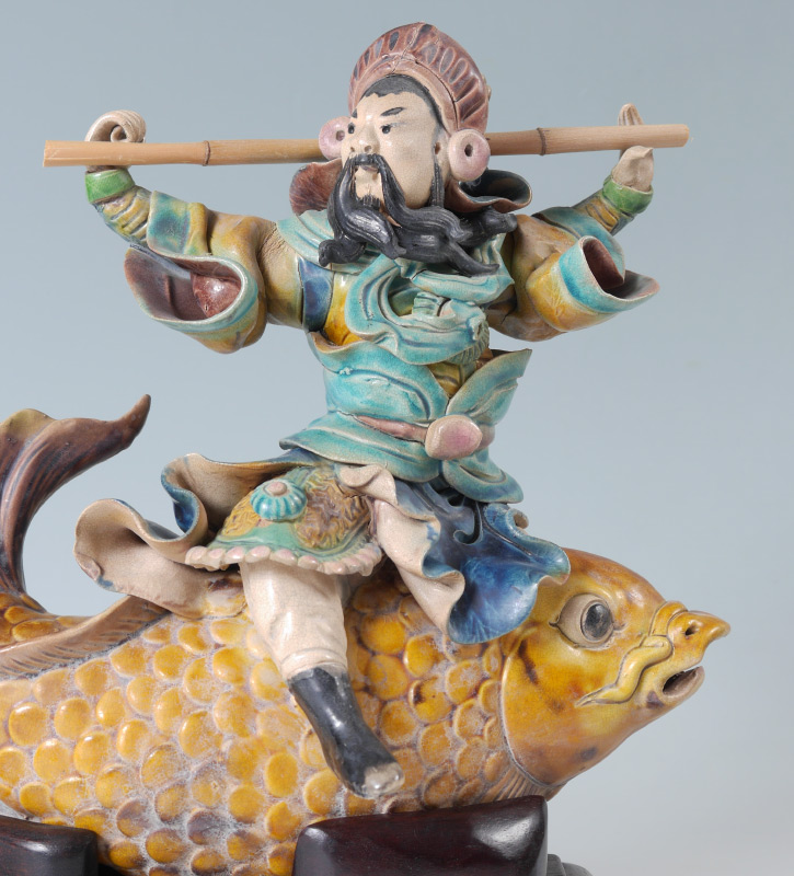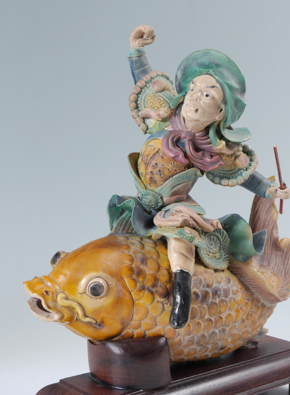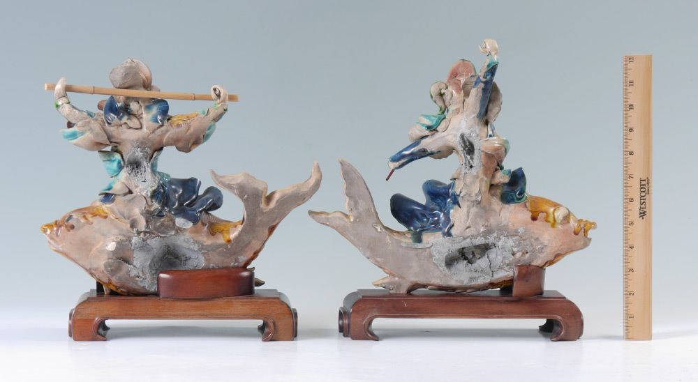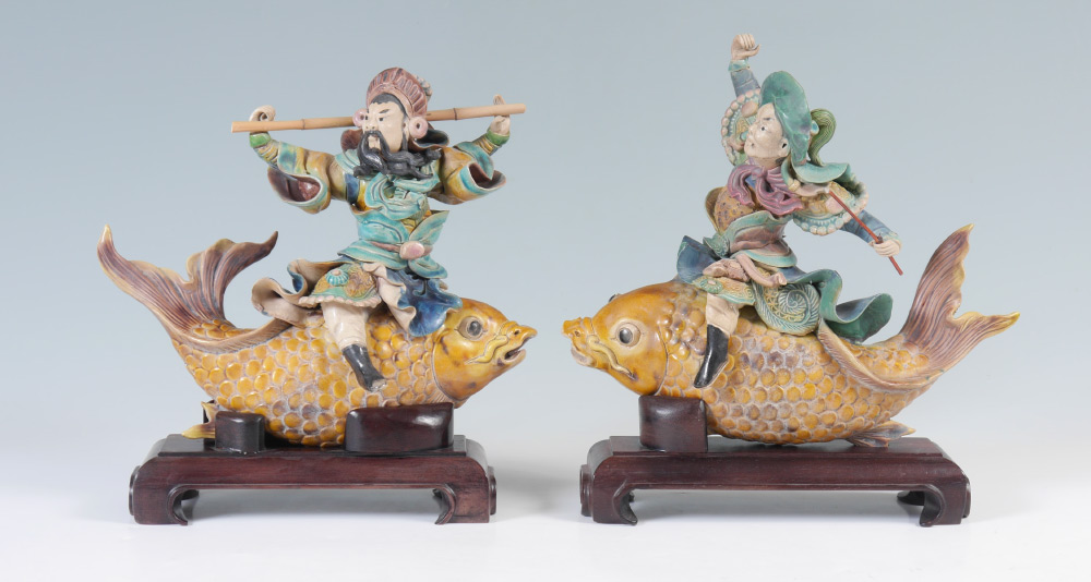 2 CHINESE POLYCHROME ROOF TILES: 2 pieces total, each featuring a warrior riding a carp. Larger of the 2 measures 10 1/2'' h. x 12 1/2'' x 5''. Sold with wood stands, 2'' h. x 9 3/4'' h. x 3 1/2''.