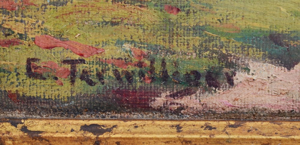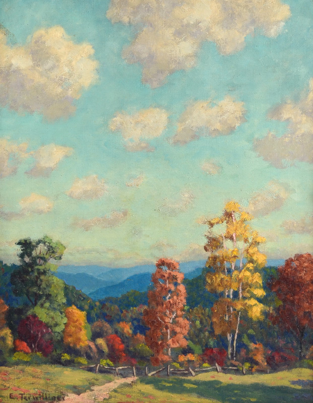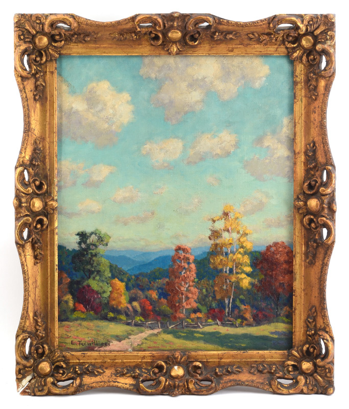 TERWILLIGER, Edward, (American, 1872-?): Autumnal Scene with Panorama of Valley, Oil/Canvas Laid on Masonite, 20'' x 16'', signed lower left, pierce carved frame, 25'' x 21''. CONDITION: Needs cleaning, minor craquelure, frame shows wear, sold as is.