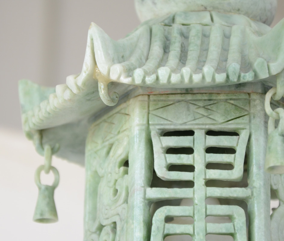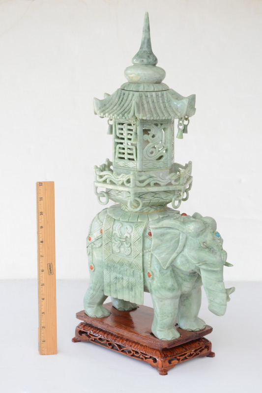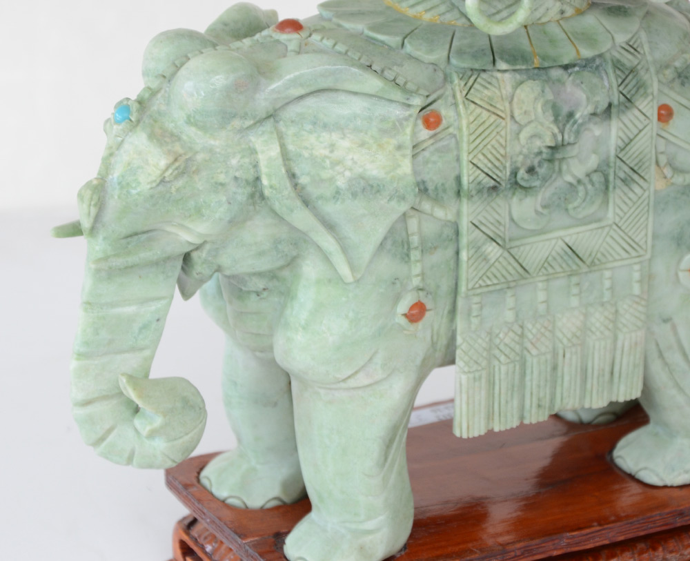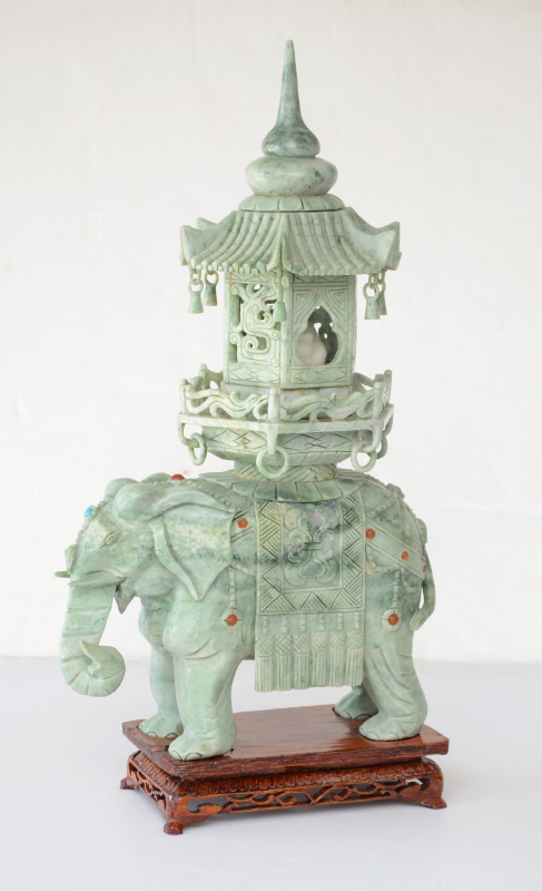 LARGE CHINESE CARVED STONE ELEPHANT CENSER: Large carved elephant with stone cabochons, pagoda form caravan, seated Buddha figure inside. Measures 21'' x 12'' x 4 1/2''. Sold with fitted carved wood base, 2 1/4'' x 9 1/4'' x 5 1/2''.