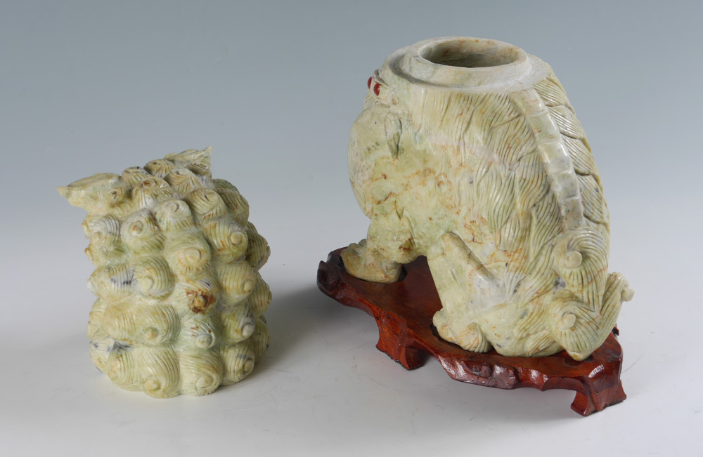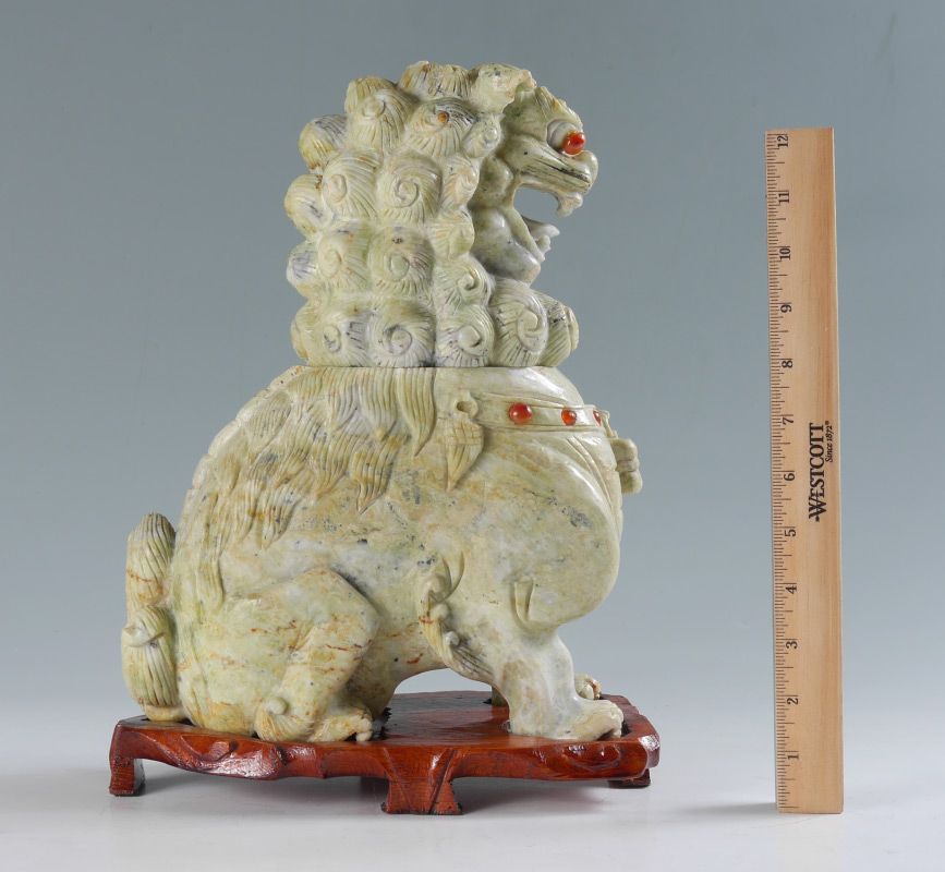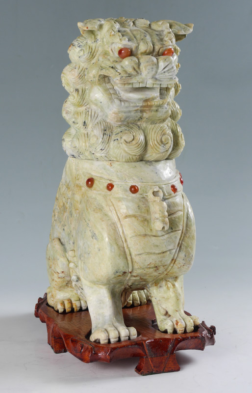 CHINESE CARVED STONE TEMPLE LION: Nicely carved figure of a temple lion with stone cabochon eyes and necklace. Removable head opens to open storage, measures 12 1/2'' x 9 3/4'' x 5''. Sold with fitted carved wood base, 1 1/2'' h. x 10'' x 6''.