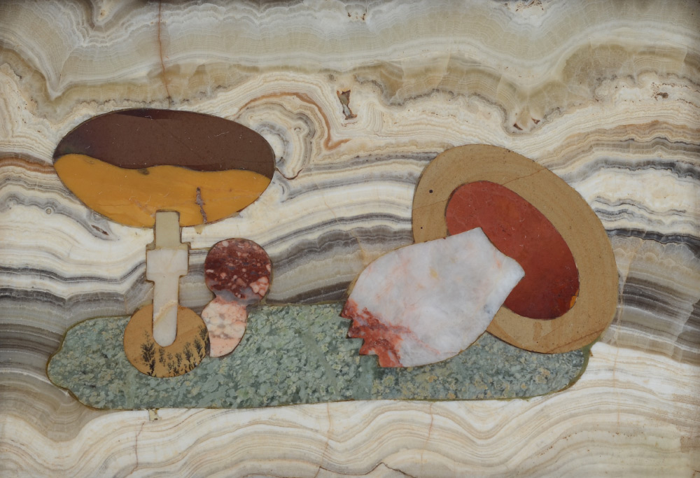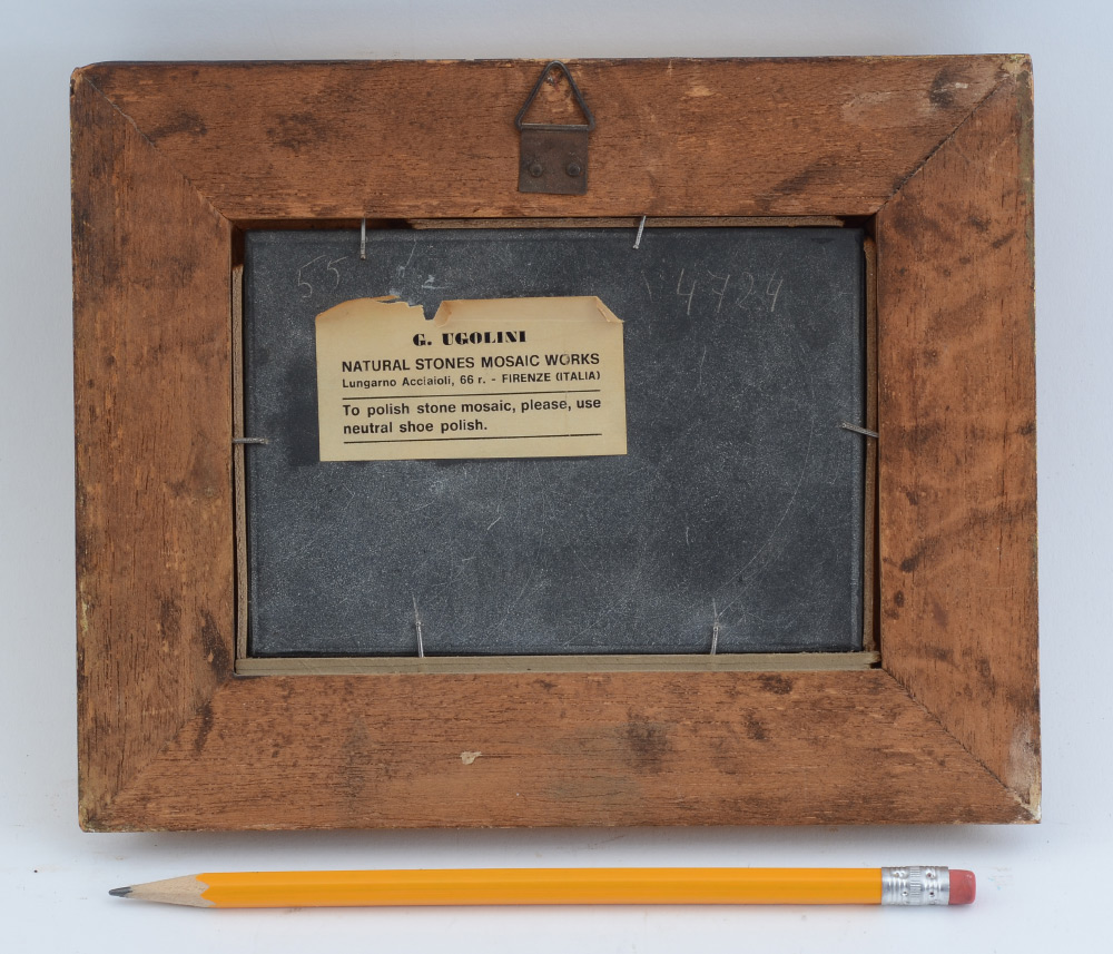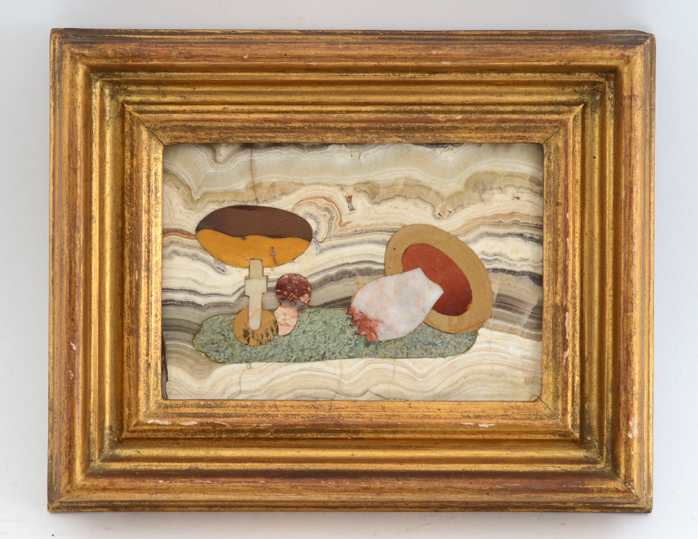 G. UGOLINI ITALIAN MOSAIC OF MUSHROOMS: 3.5'' x 5'', original label affixed verso, original frame, 6.25'' x 8''.