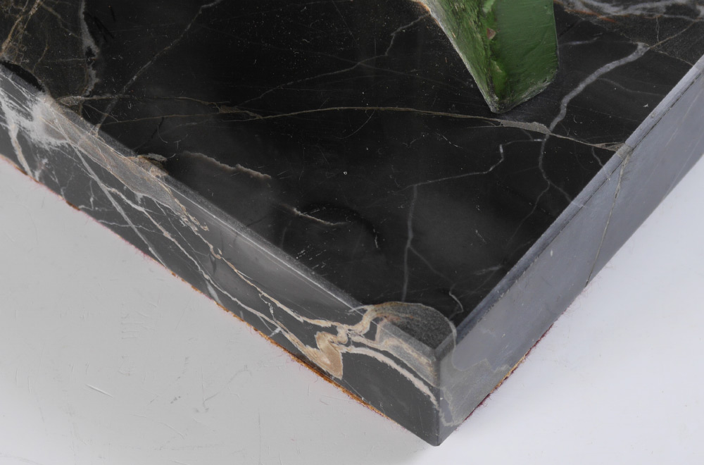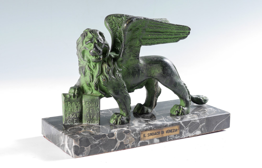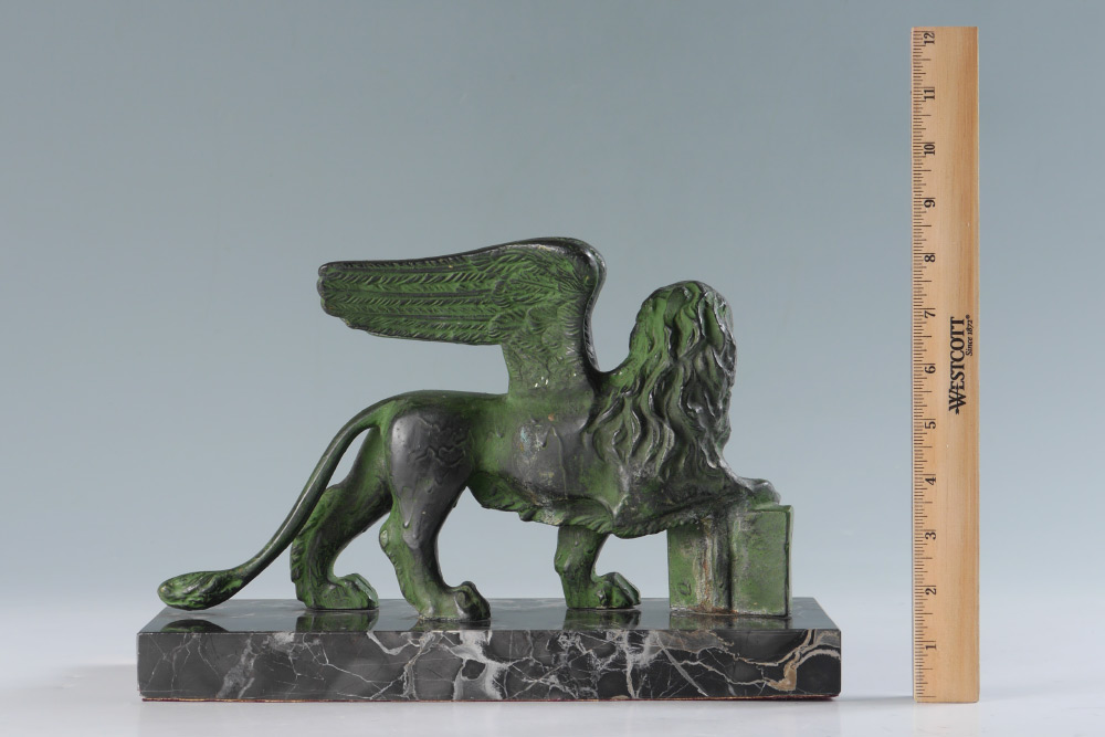 BRONZE WINGED LION OF VENICE ON MARBLE STAND: Patinated bronze figure titled ''Il Sindaco Di Venezia'' affixed to marble plinth, foil label reads A. Santi, Venezia. 8 1/2'' h. x 12 3/4'' x 5 1/4''.