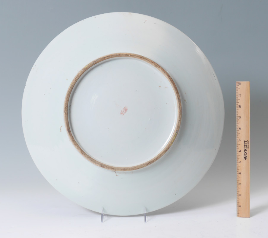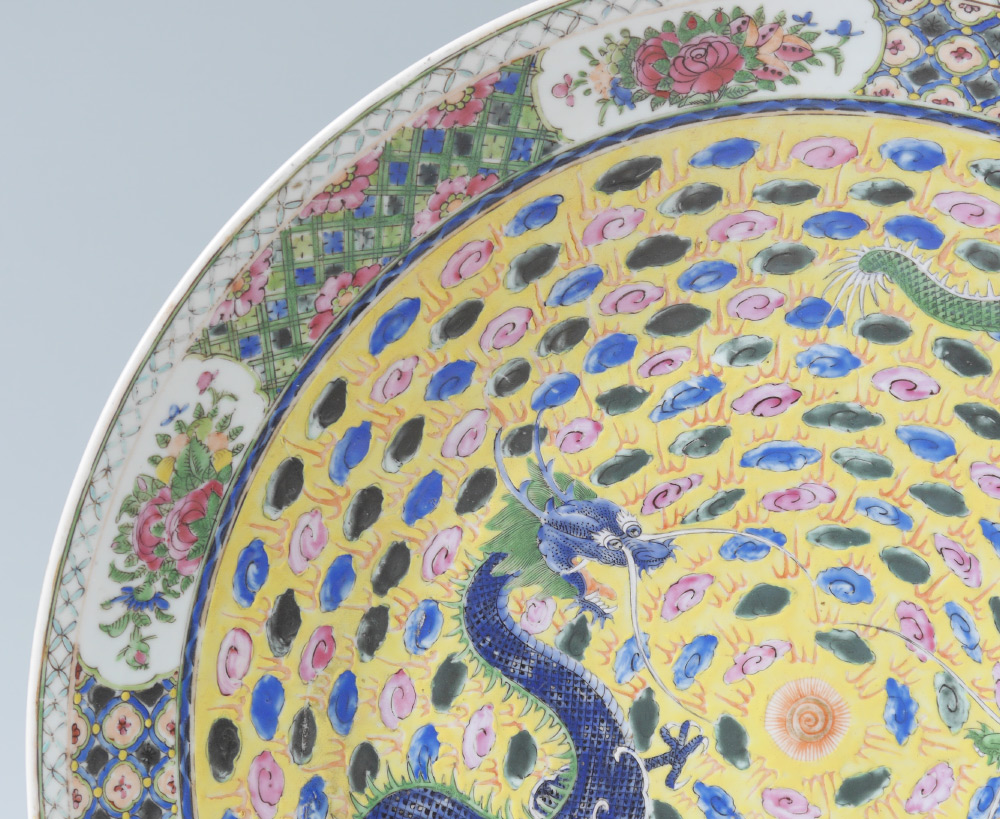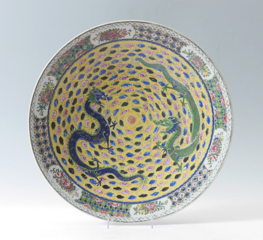 CHINESE FAMILLE JUANE DRAGON CHARGER: Famille juane center with battling dragons in clouds motif, floral rim with medallions. Stamped China on base, 3'' h. x 18 1/2''.