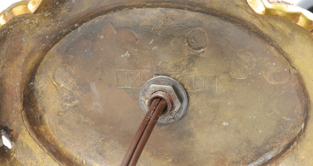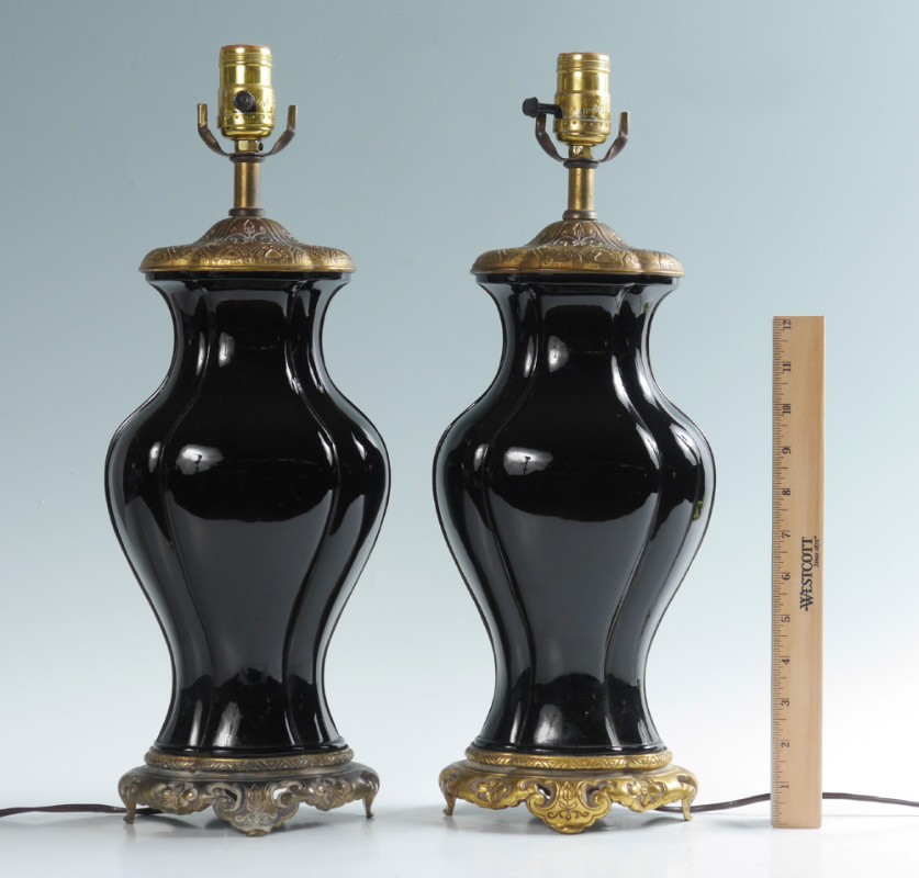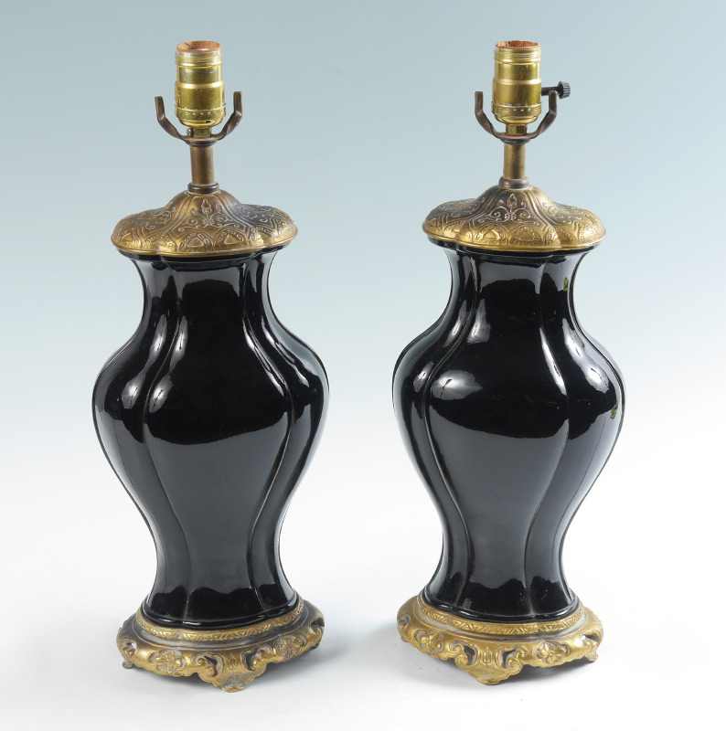 PAIR DARK AMETHYST GLASS LAMPS: Darkest amethyst glass baluster form ribbed bodies, gilt cast metal base and cap marked M. C. Co., single socket fixture. Overall measures 18 1/2'' h. x 6 1/2'' x 4 3/4''.