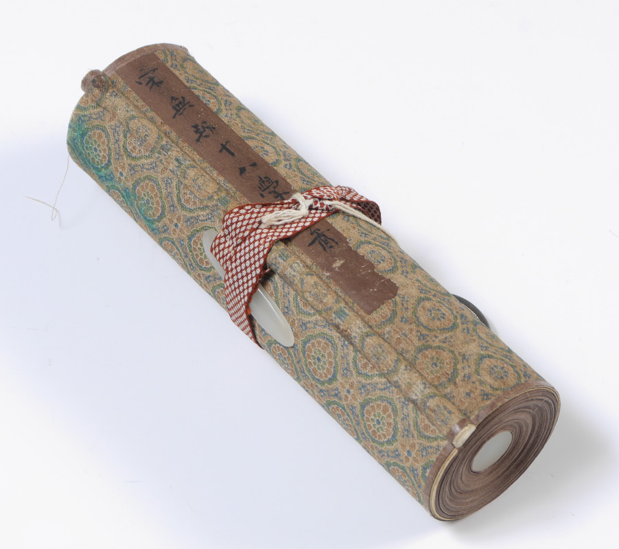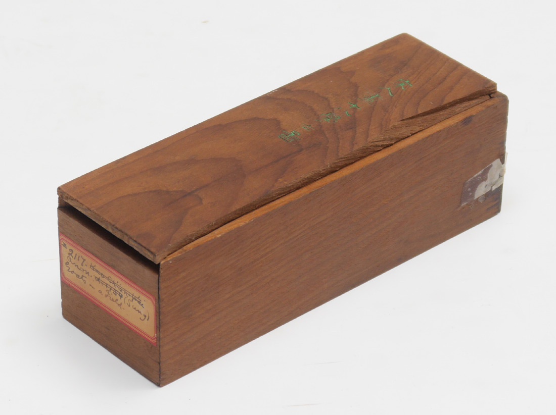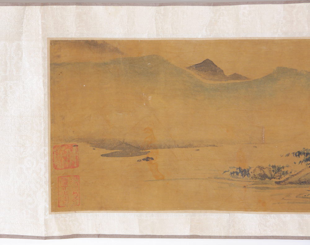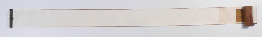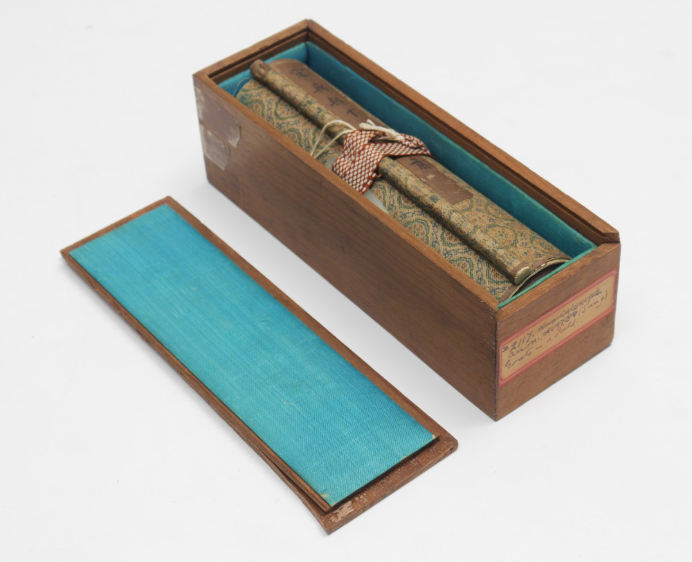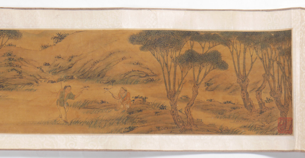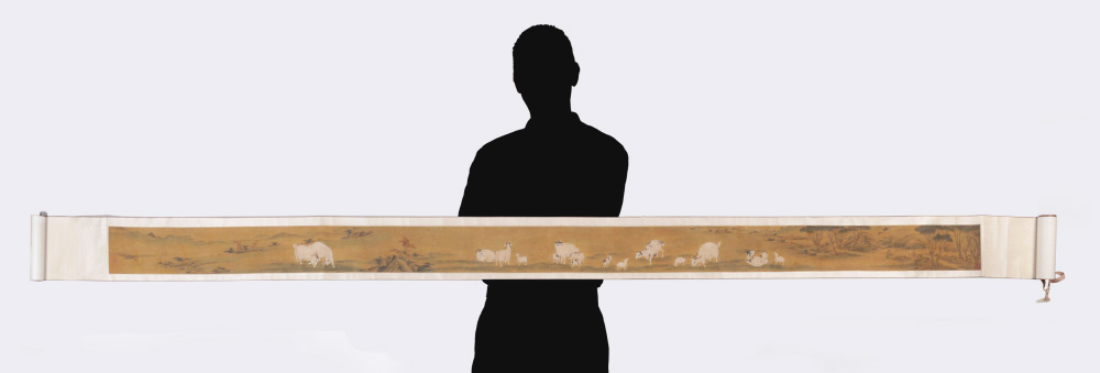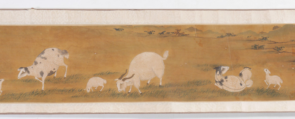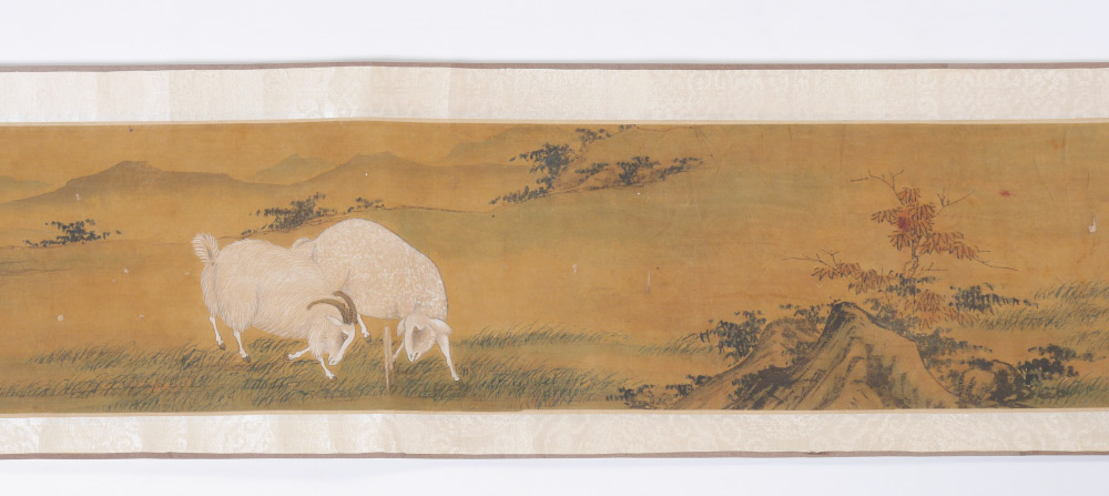 SUNG? (SONG) CHINESE SCROLL WITH GOATS: Image measures 5.5'' x 8'8''l., scroll overall measures 7.25'' x 22'6''l. With original box, 8.25'' x 2.75'' x 2.75'', damage to lid.