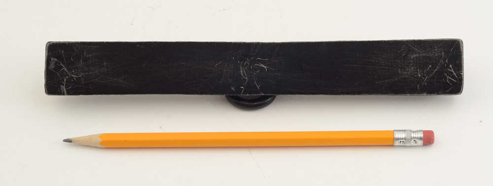 CHINESE IRON SCROLL WEIGHT: Black iron with embossed symobolic design, ring handle to top, 8''l. x 1''w. Perfect weight for previous lot 1405A.